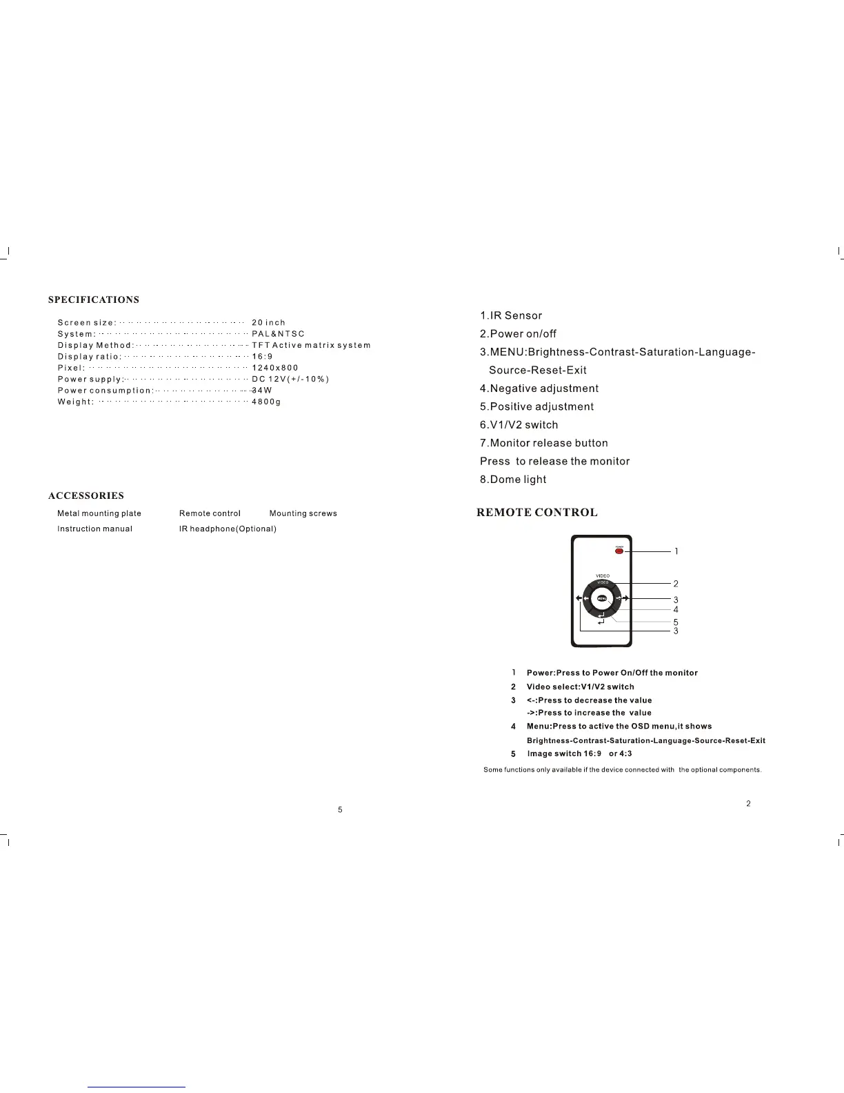 Tview T206IR - SPECIFICATIONS; ACCESSORIES; REMOTE CONTROL; Power On;Off Button