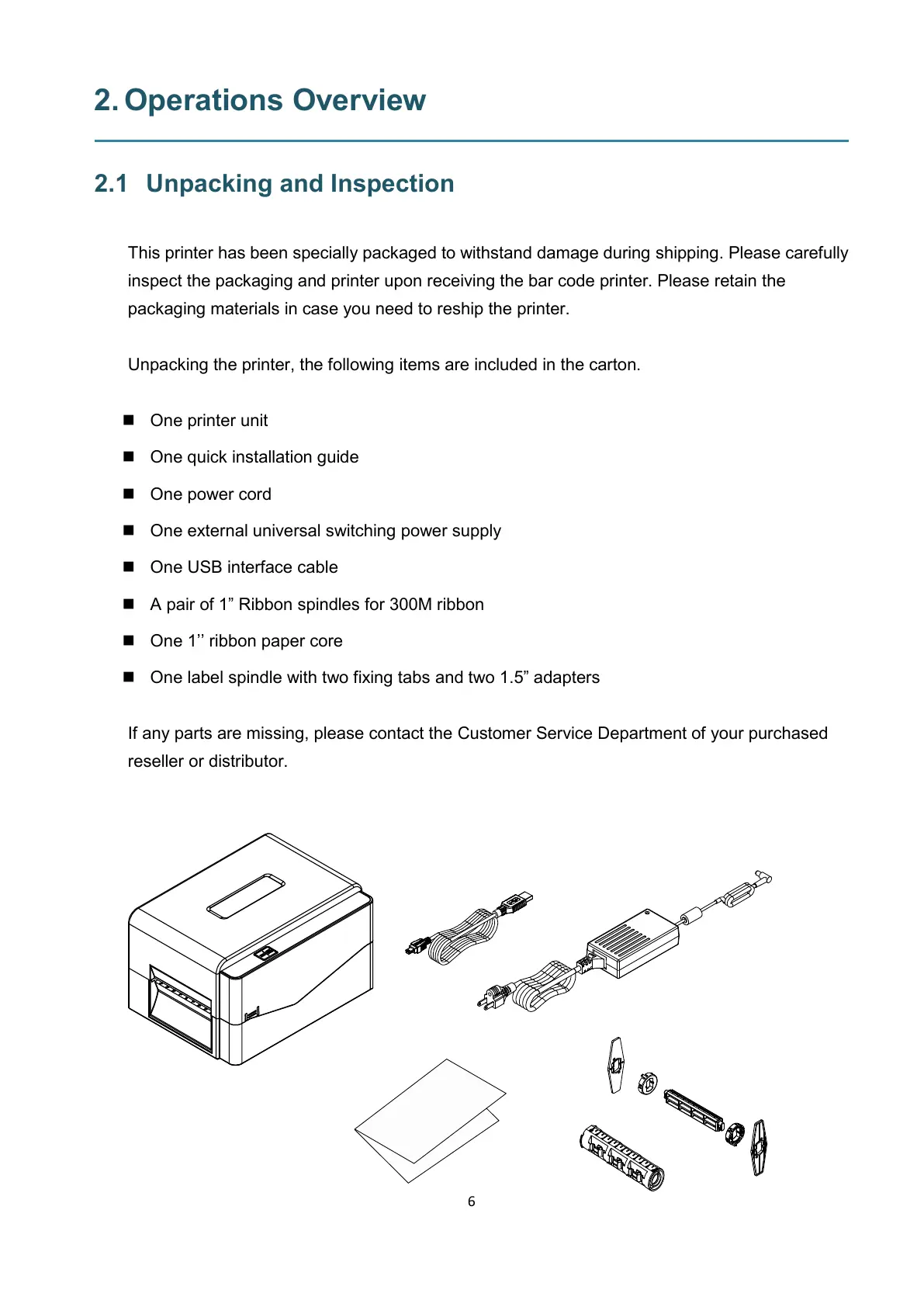 inspect the packaging and printer upon receiving the bar code printer. Please retain the