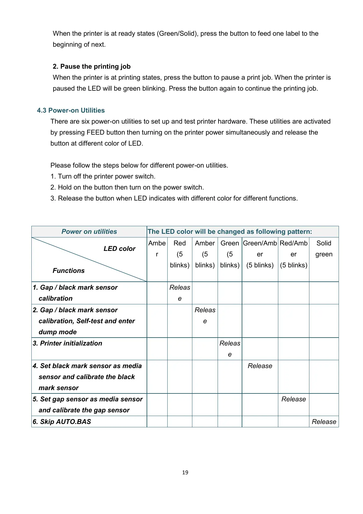 paused the LED will be green blinking. Press the button again to continue the printing job.