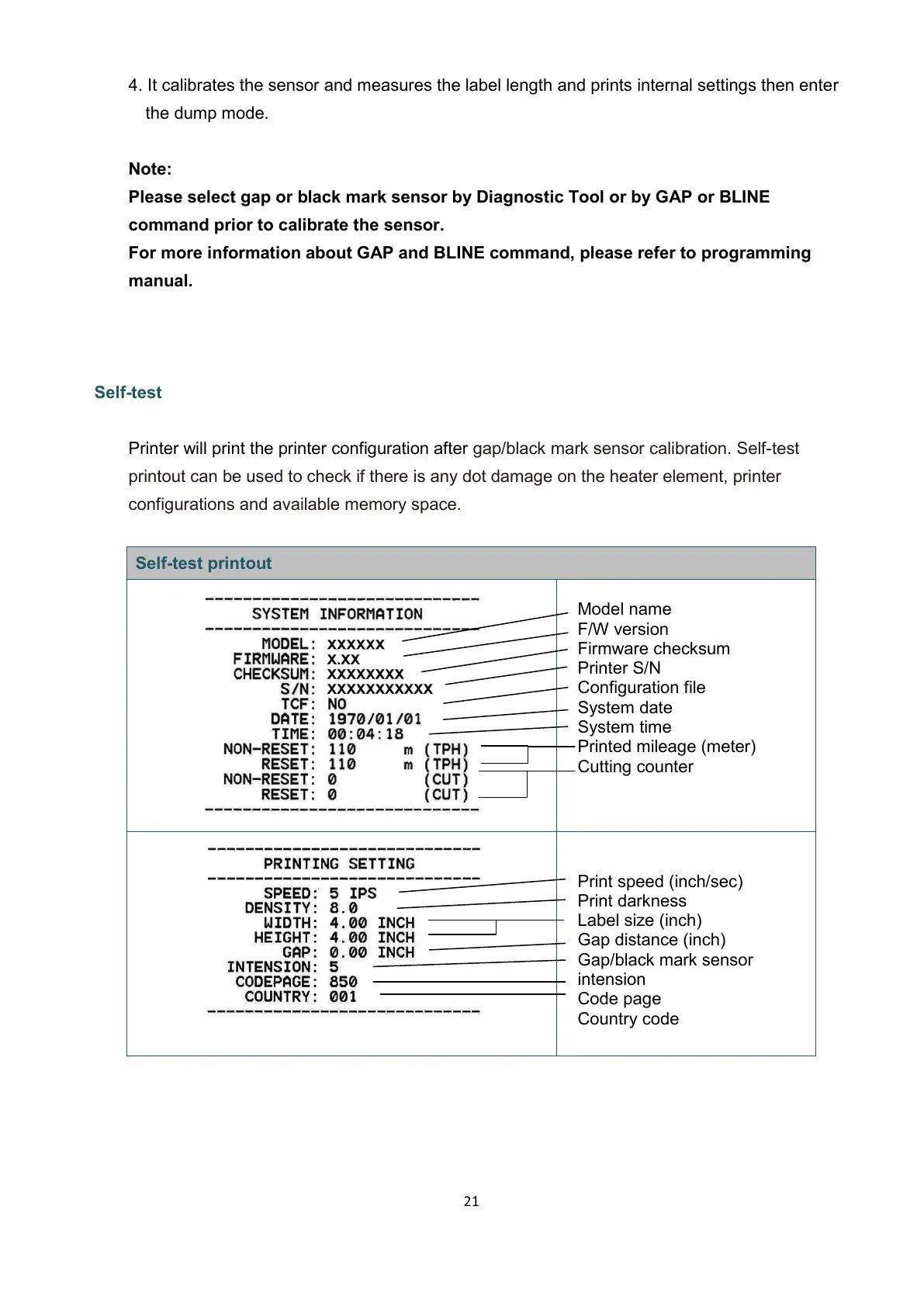Printer will print the printer configuration after gap/black mark sensor calibration. Self-test