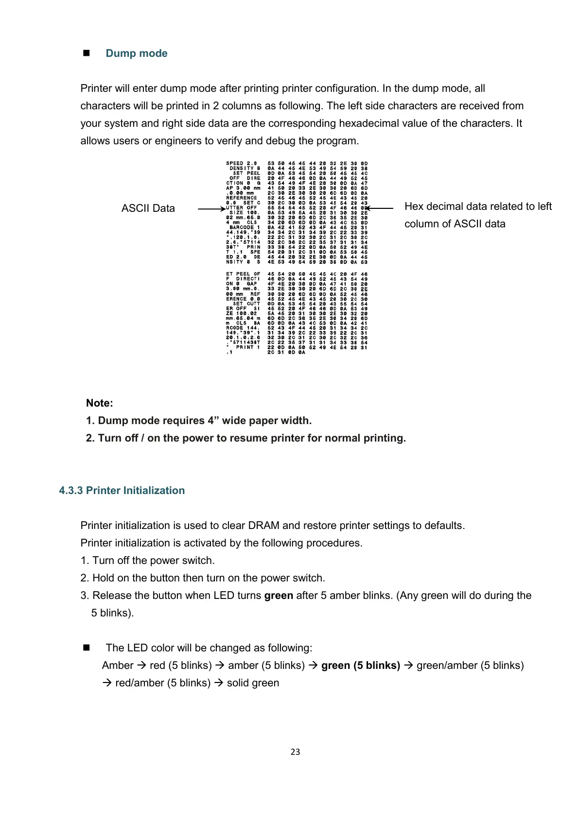 Printer will enter dump mode after printing printer configuration. In the dump mode, all
