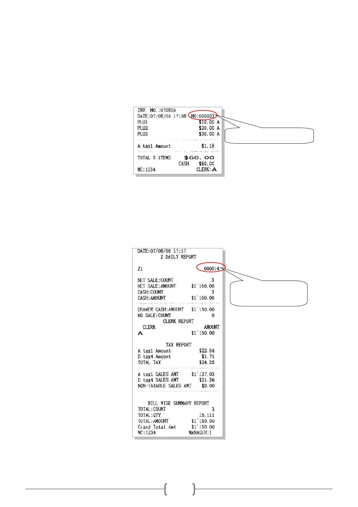 Input a new start number when the LCD prompts: <INPUT NO>, and press [CASH]. Then, the receipt number will