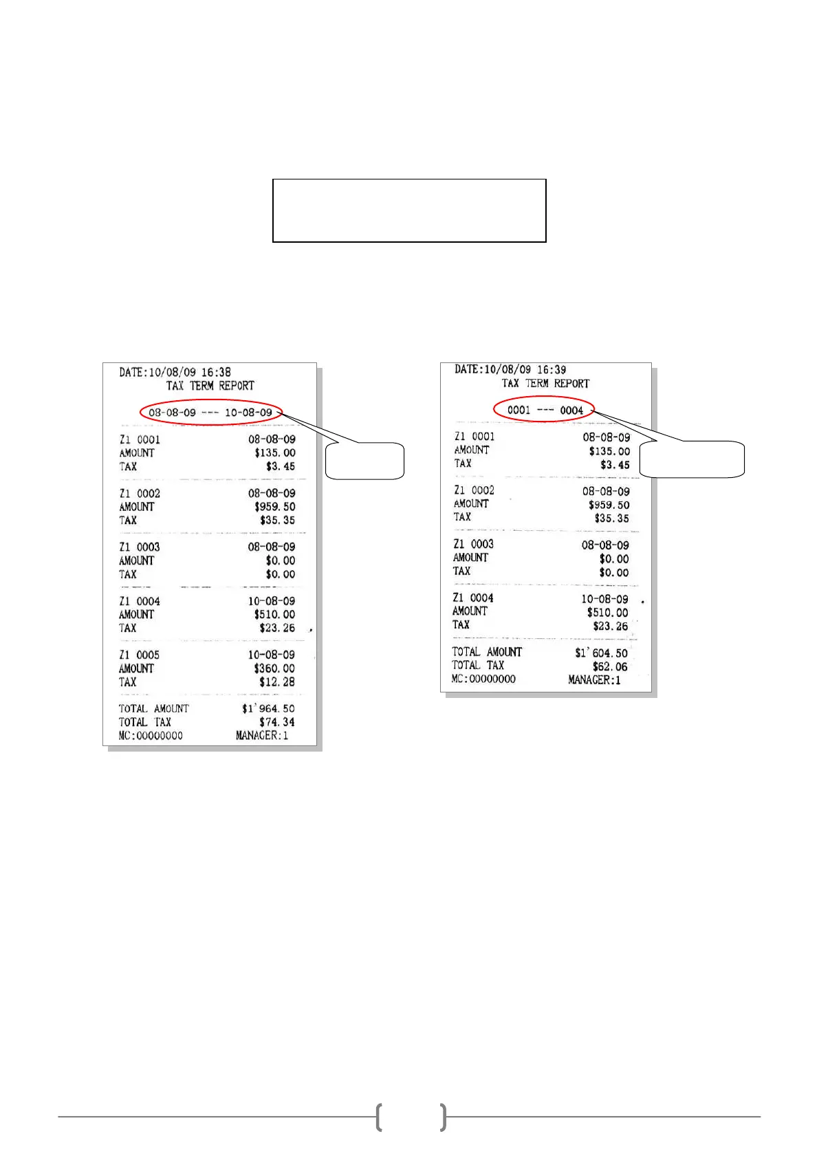 In Z mode, use key [↑] or [↓] to choose item ‗TAX TERM REPORT‘, and press key [CASH].