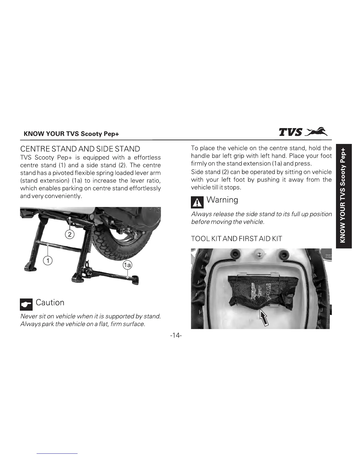 TVS Scooty Pep Plus - Centre Stand and Side Stand; Tool Kit and First Aid Kit