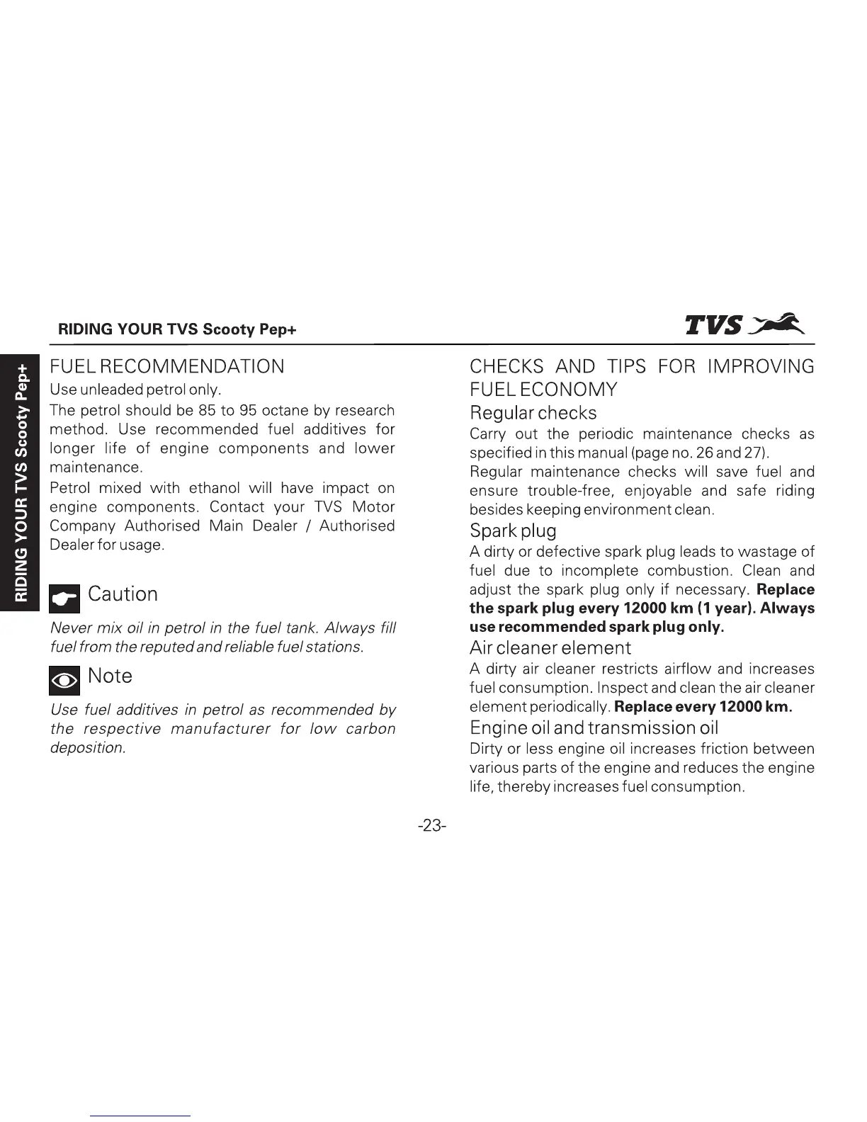 TVS Scooty Pep Plus - Fuel Recommendation; Checks and Tips for Improving Fuel Economy; Regular Checks