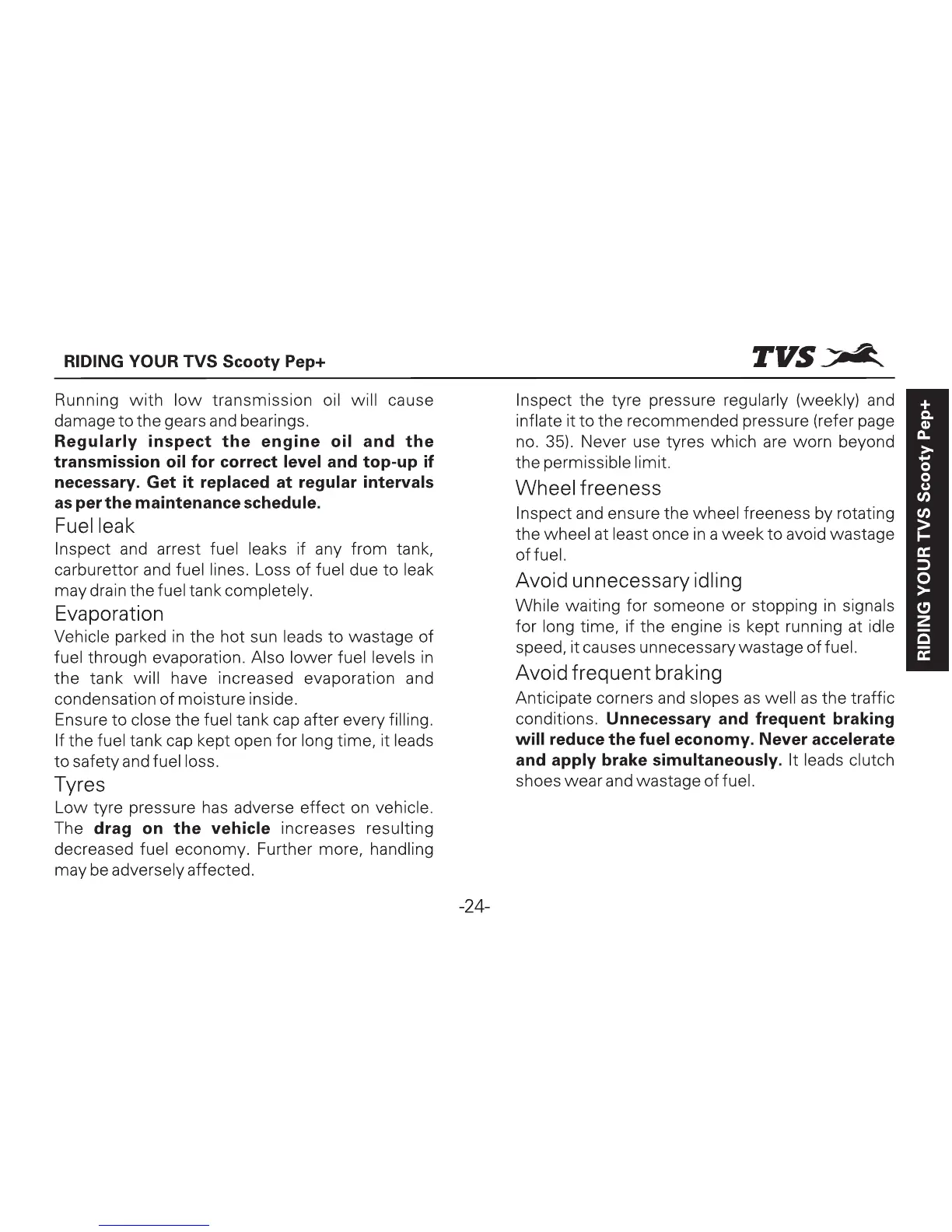 TVS Scooty Pep Plus - Fuel Leak; Evaporation; Tyres; Wheel Freeness