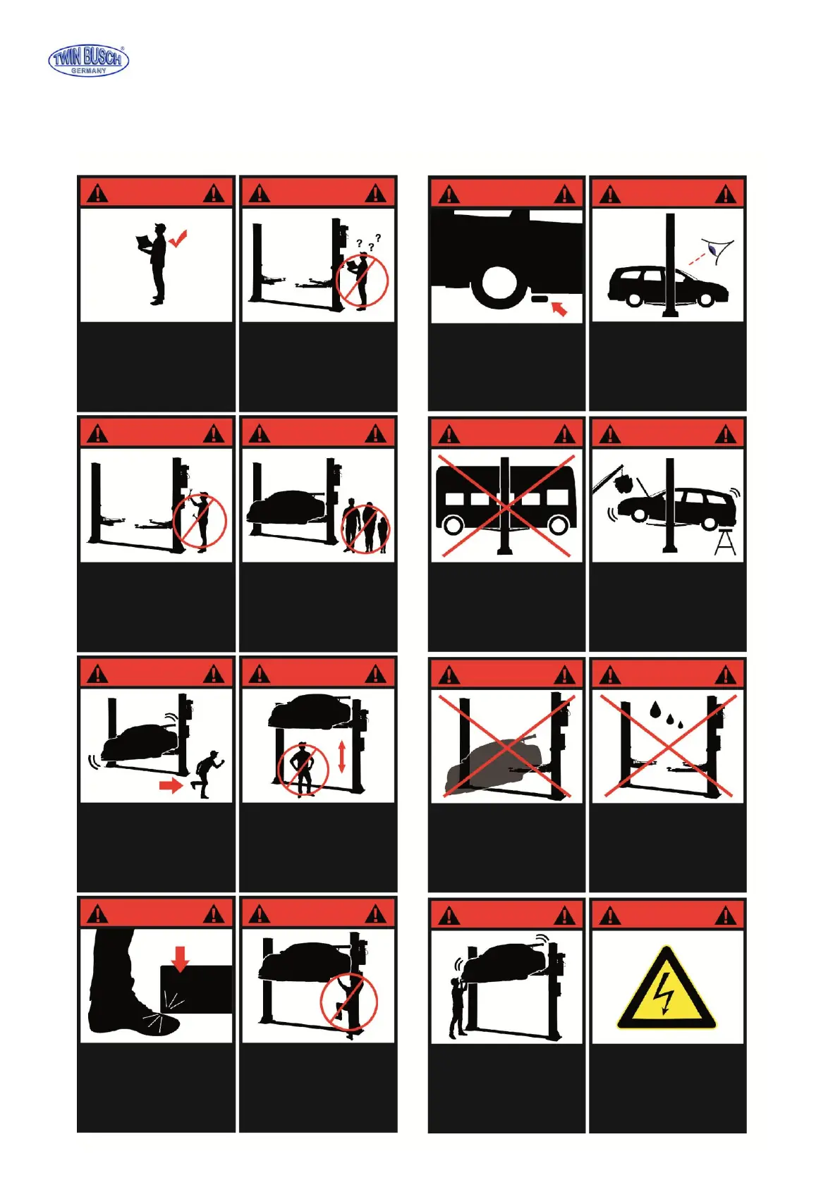 All safety warning labels are clearly depicted on the lift to ensure that the operator is aware of dangers during operation.
