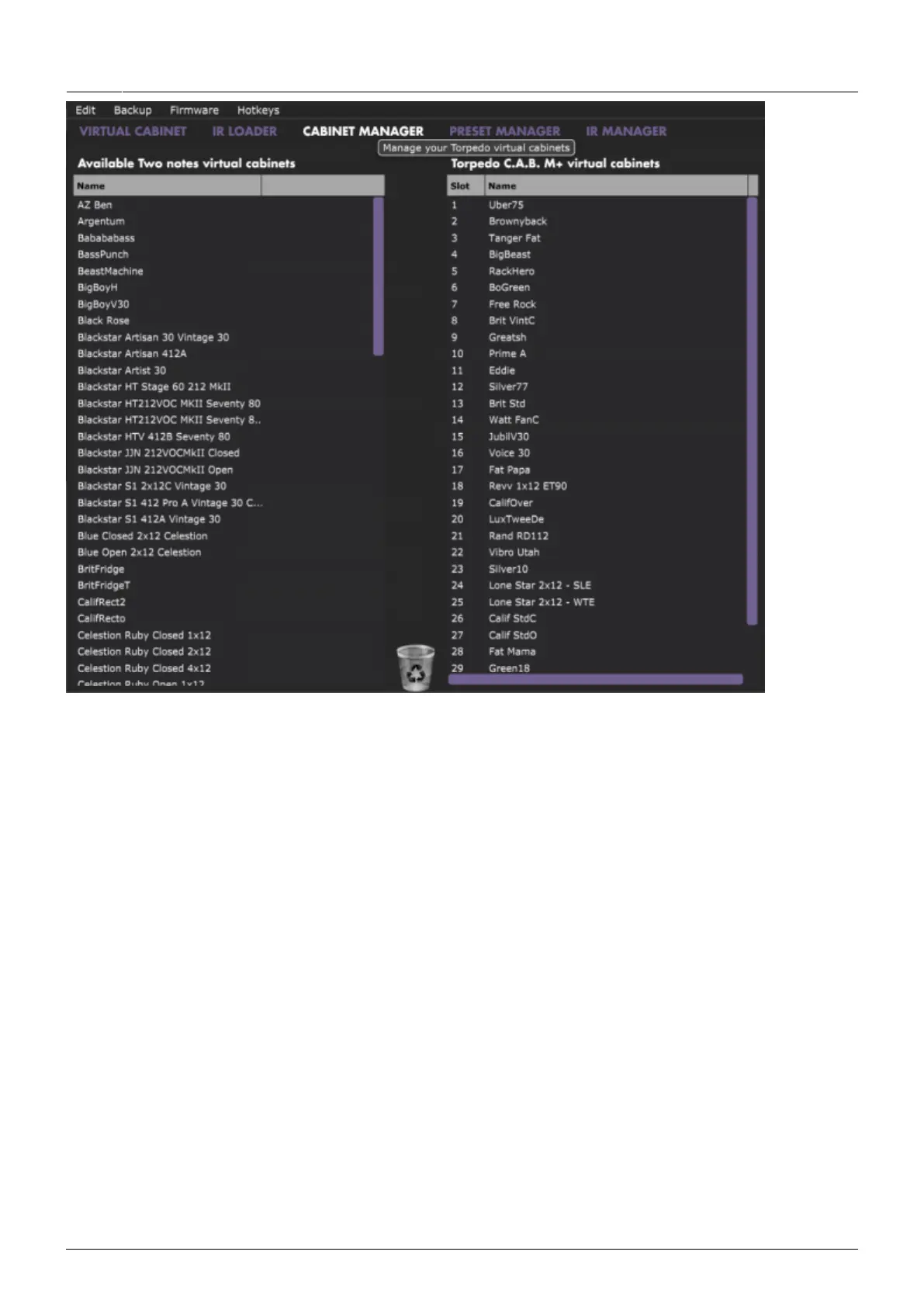 Use the PRESET MANAGER tab to manage the presets in Torpedo C.A.B. M+. The Left panel indicates