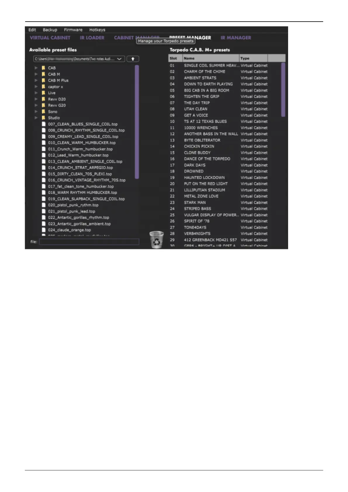 cabinets are stored : • “%APPDATA\Two notes Audio Engineering\Cabinets” on Windows™ •