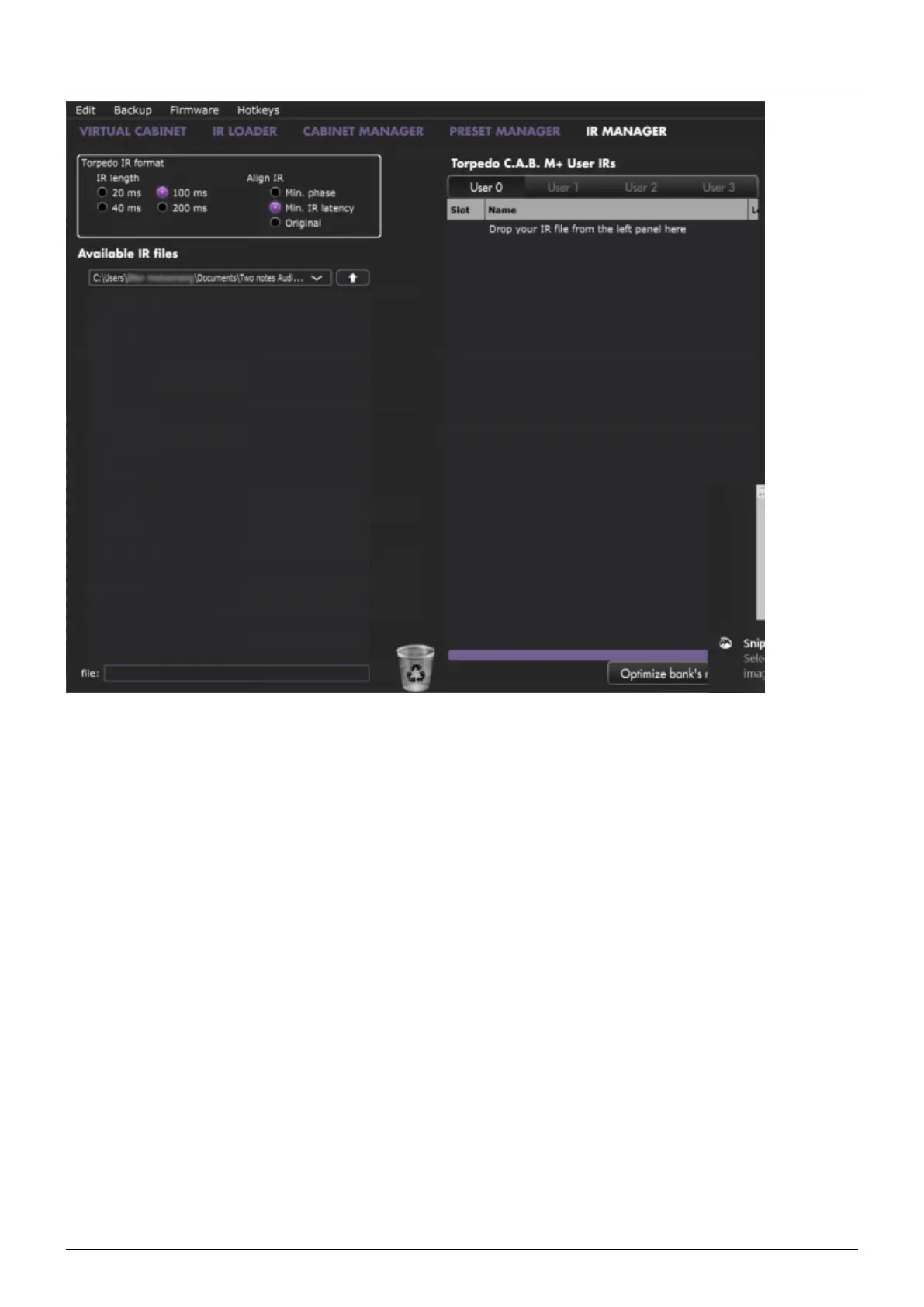 IRs. The right side represents the IR files that are loaded in the Torpedo C.A.B. M+. You can drag and