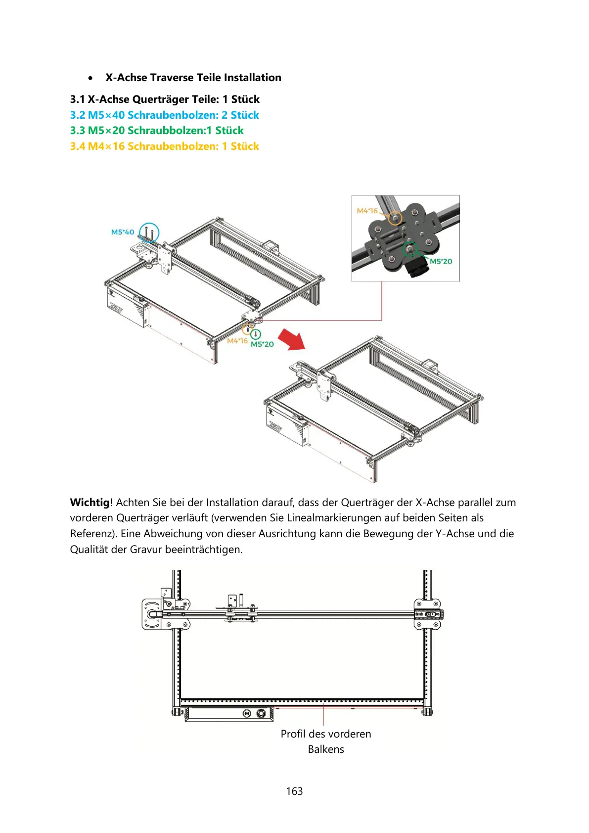 Wichtig! Achten Sie bei der Installation darauf, dass der Querträger der X-Achse parallel zum