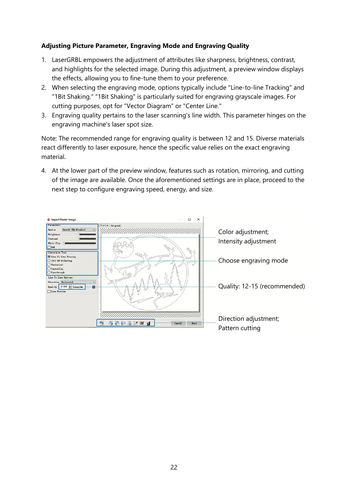 Adjusting Picture Parameter, Engraving Mode and Engraving Quality