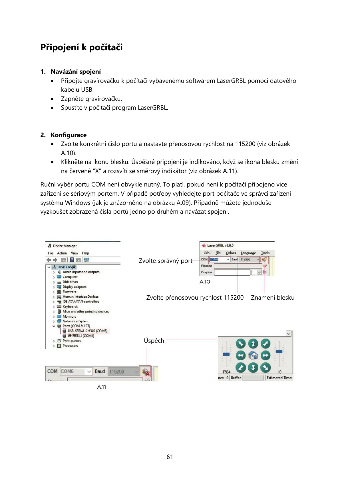 Připojte gravírovačku k počítači vybavenému softwarem LaserGRBL pomocí datového