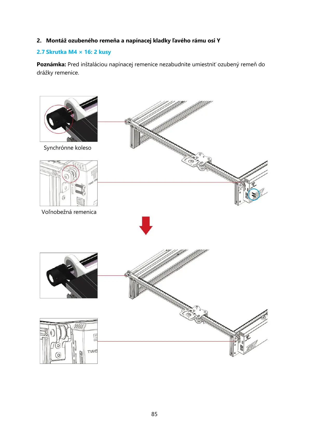 2. Montáž ozubeného remeňa a nanacej kladky ľaho rámu osi Y