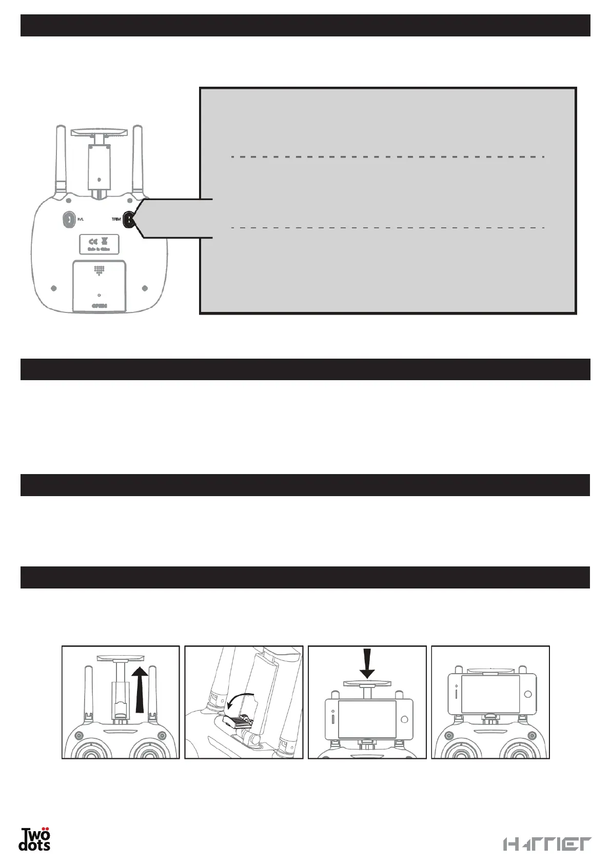 Open the controller’s antennas and extract the support, open the lower clamp and house the smartphone as