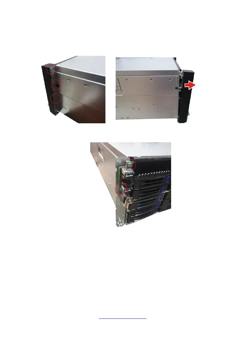 2. Loosen three screws to take out the front panel board. Loosen two screws