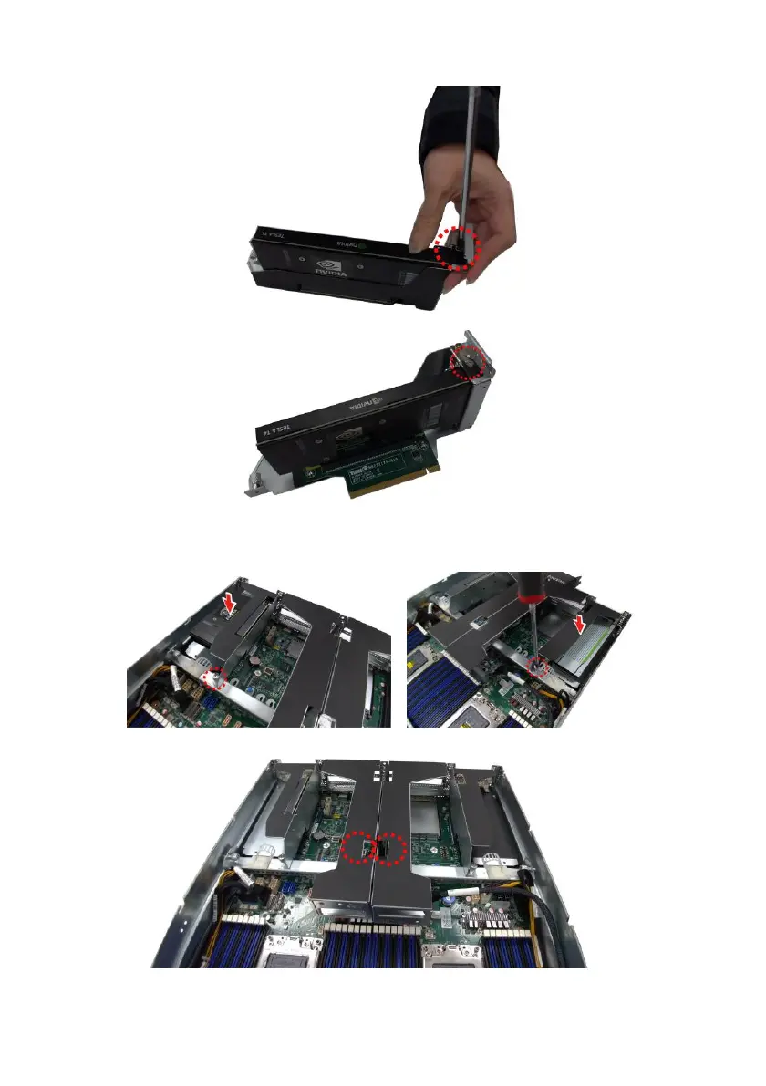 4. Insert the tesla T4 GPU card and secure the tesla T4 GPU card to the riser.