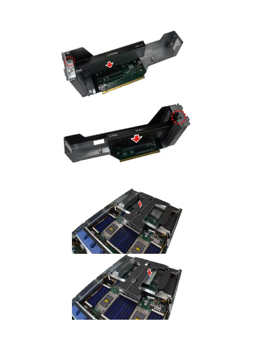 7. Insert the tesla T4 GPU card and secure the tesla T4 GPU card to the riser.
