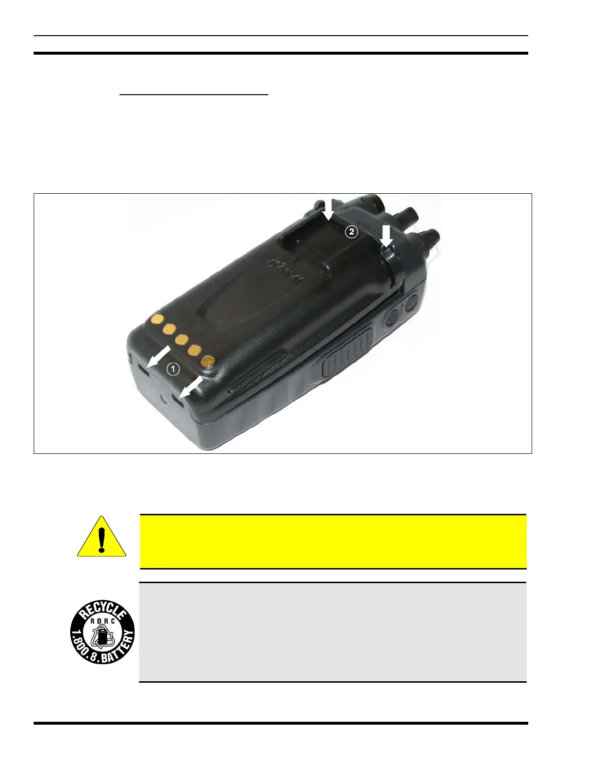 2. Push the top of the battery pack down until the latches click to attach the battery to the radio.