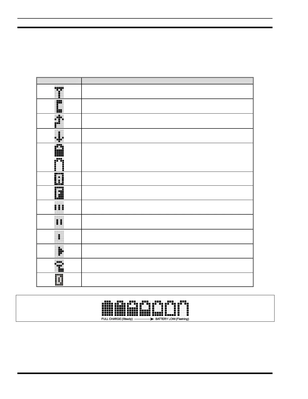 Steady – battery charge indicator. Appears in the 12th position of the display.