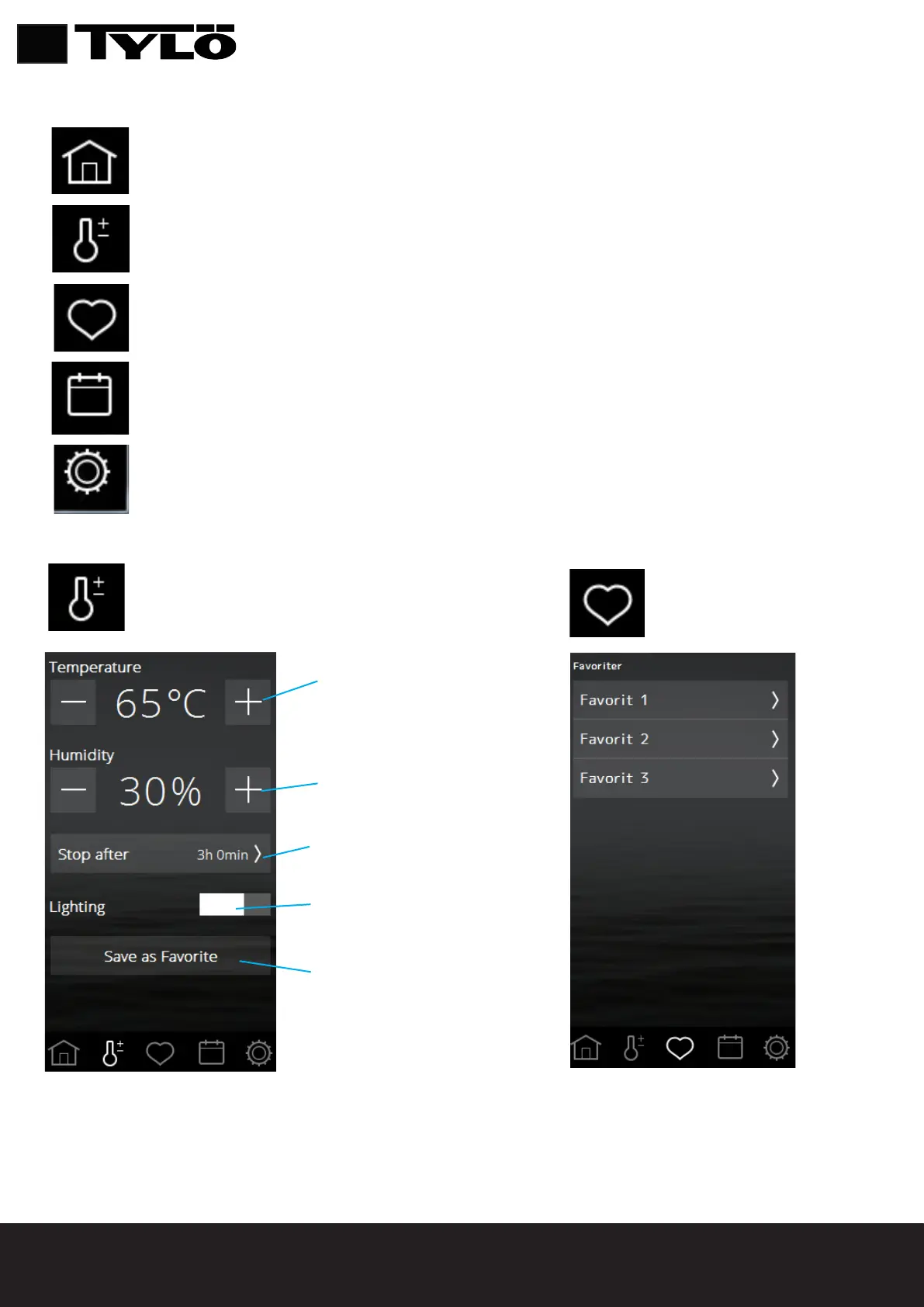 Ustawienia: Ustawienia temperatury, czasu pracy sauny, wilgotności itp.