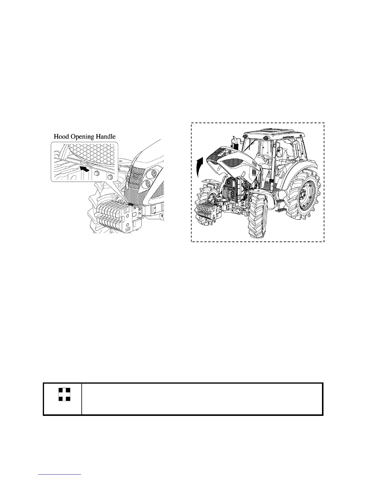 ① With one hand, take hold of the Hood opening handle and pull the handle toward to raise the bonnet.
