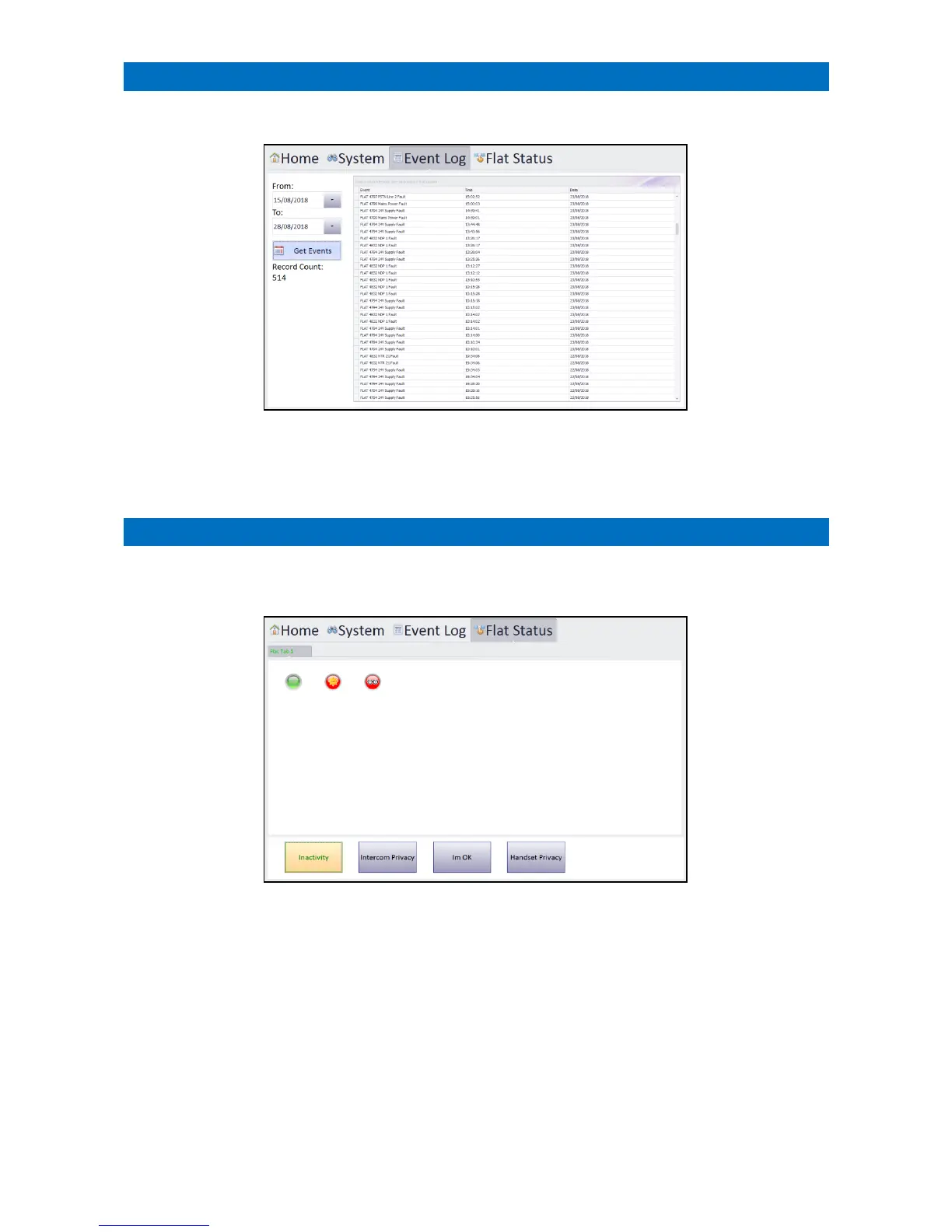 Touch the Flat Status tab to display the status of; inactivity, intercom privacy, I’m OK and door entry handset privacy.
