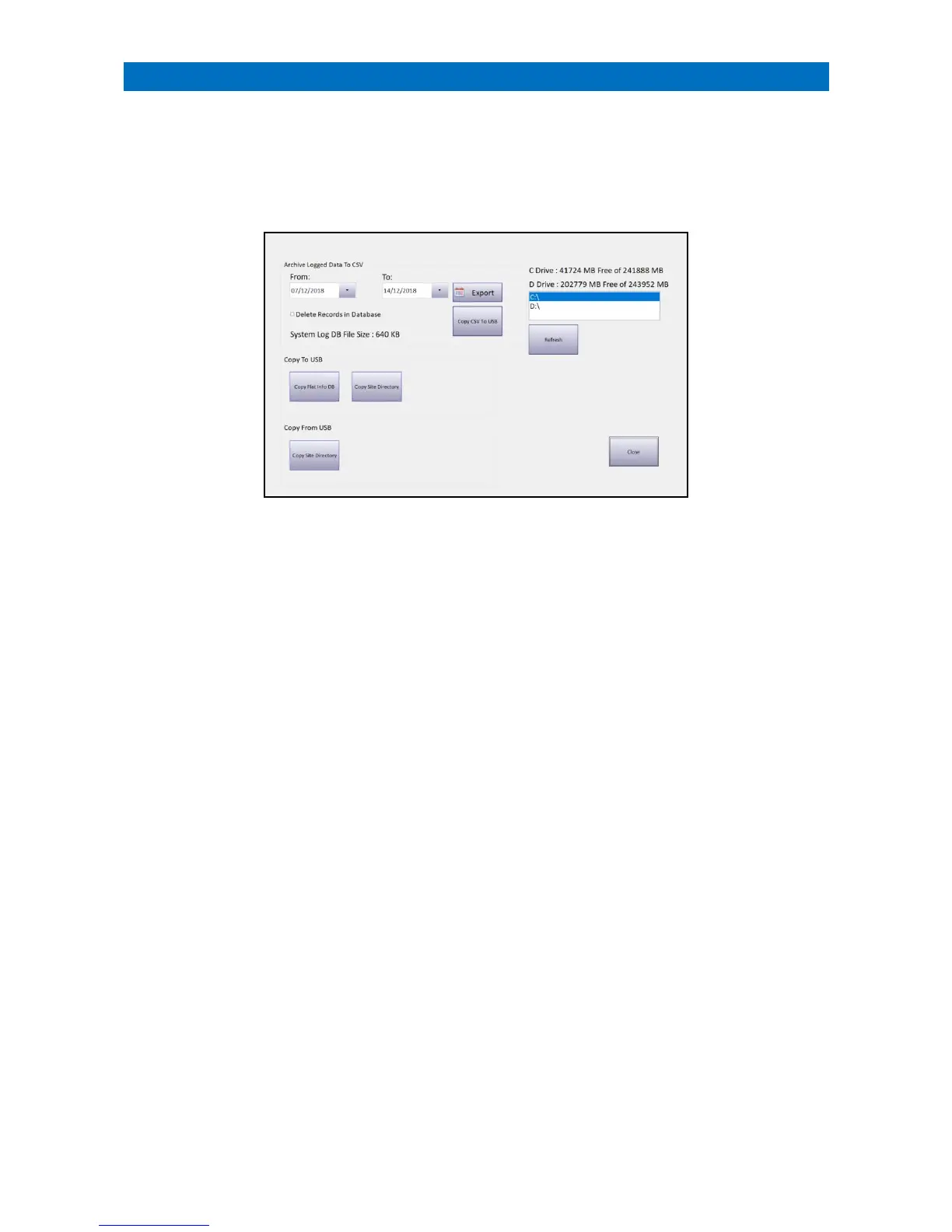 The database utility can be used to export logged data to a CSV file. The data can be selected over a date range and