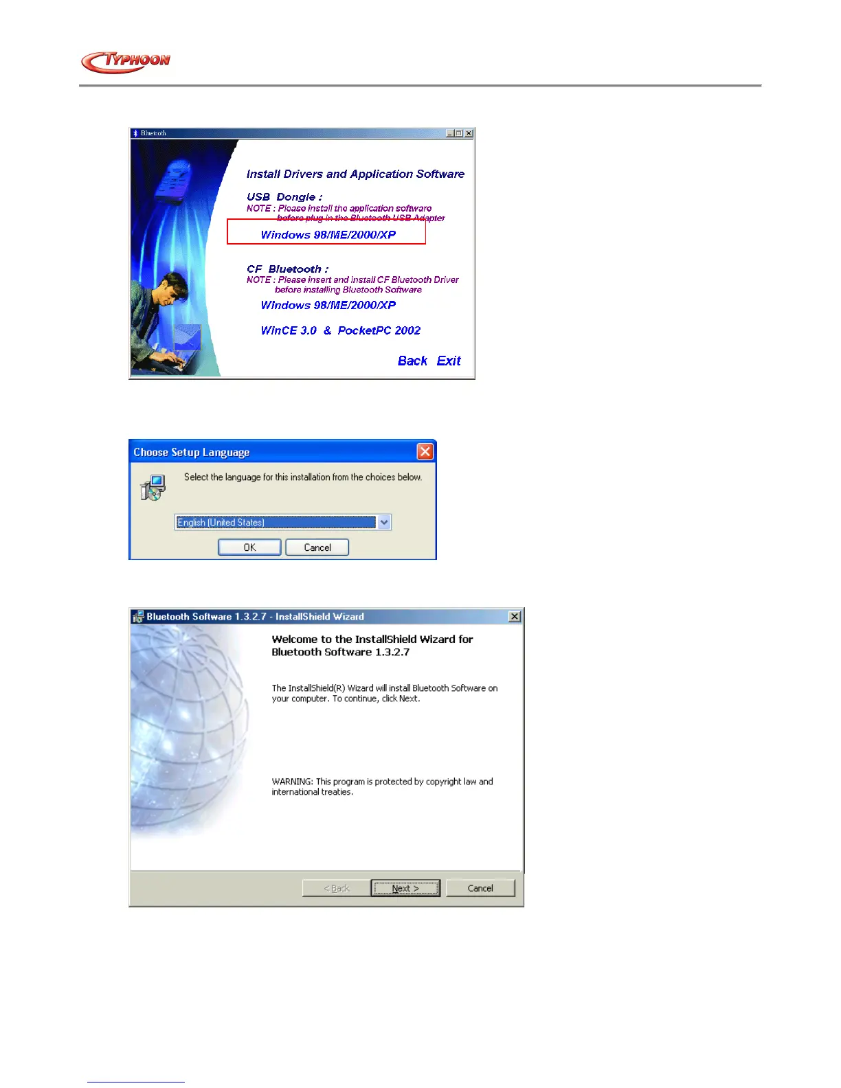 4. Under “USB Dongle:” click on the blue selection “Windows 98 / ME / 2000 / XP”. (Note: Windows 98 refers to