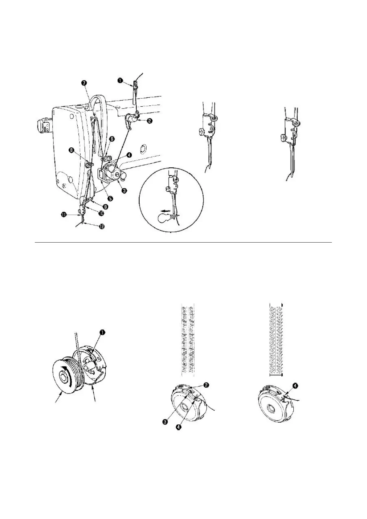 2) Pass the thread through thread slit①, then pass through the tension spring② from the bottom, and repass