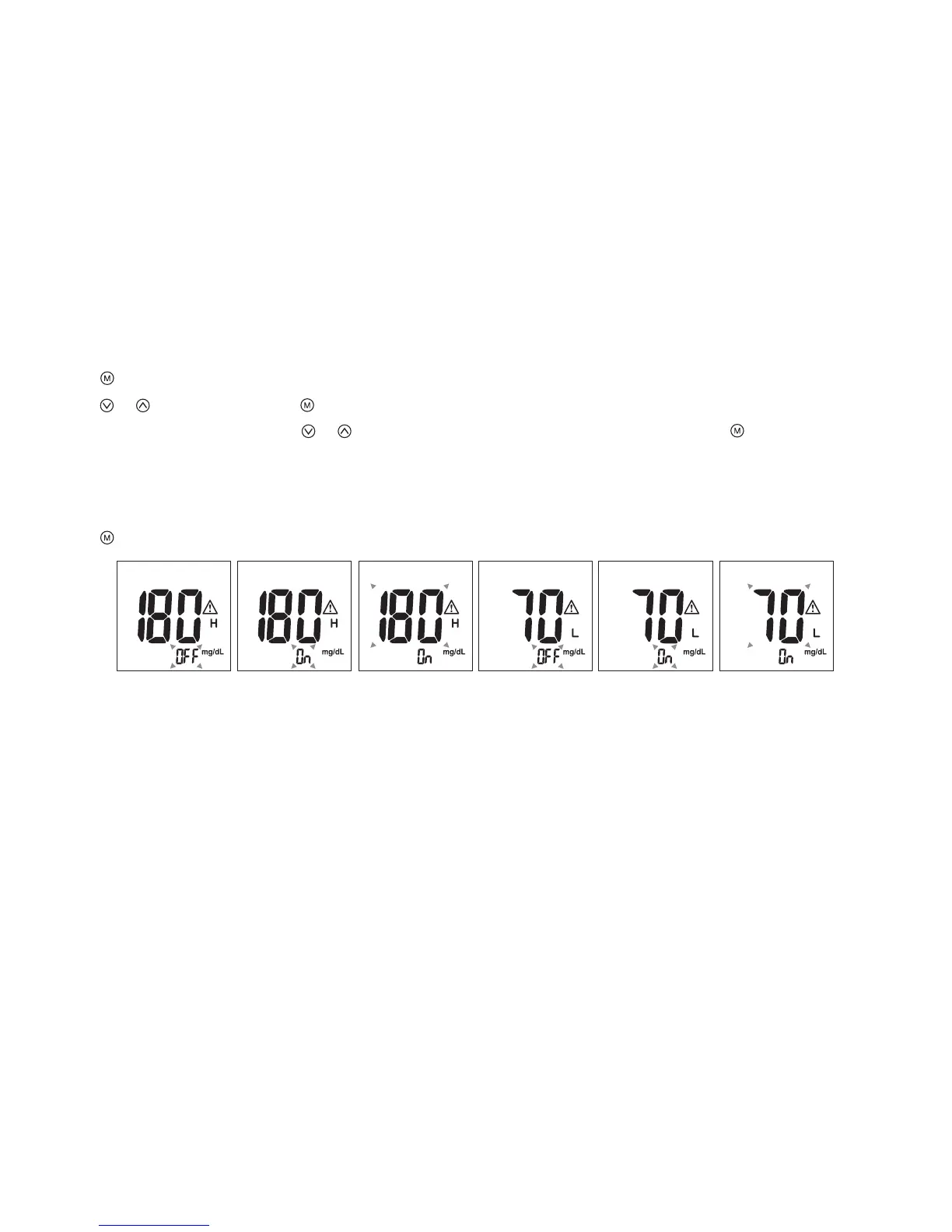 The LO alarm value range is 40 ~ 90mg/dL and the default value is 70mg/dL.