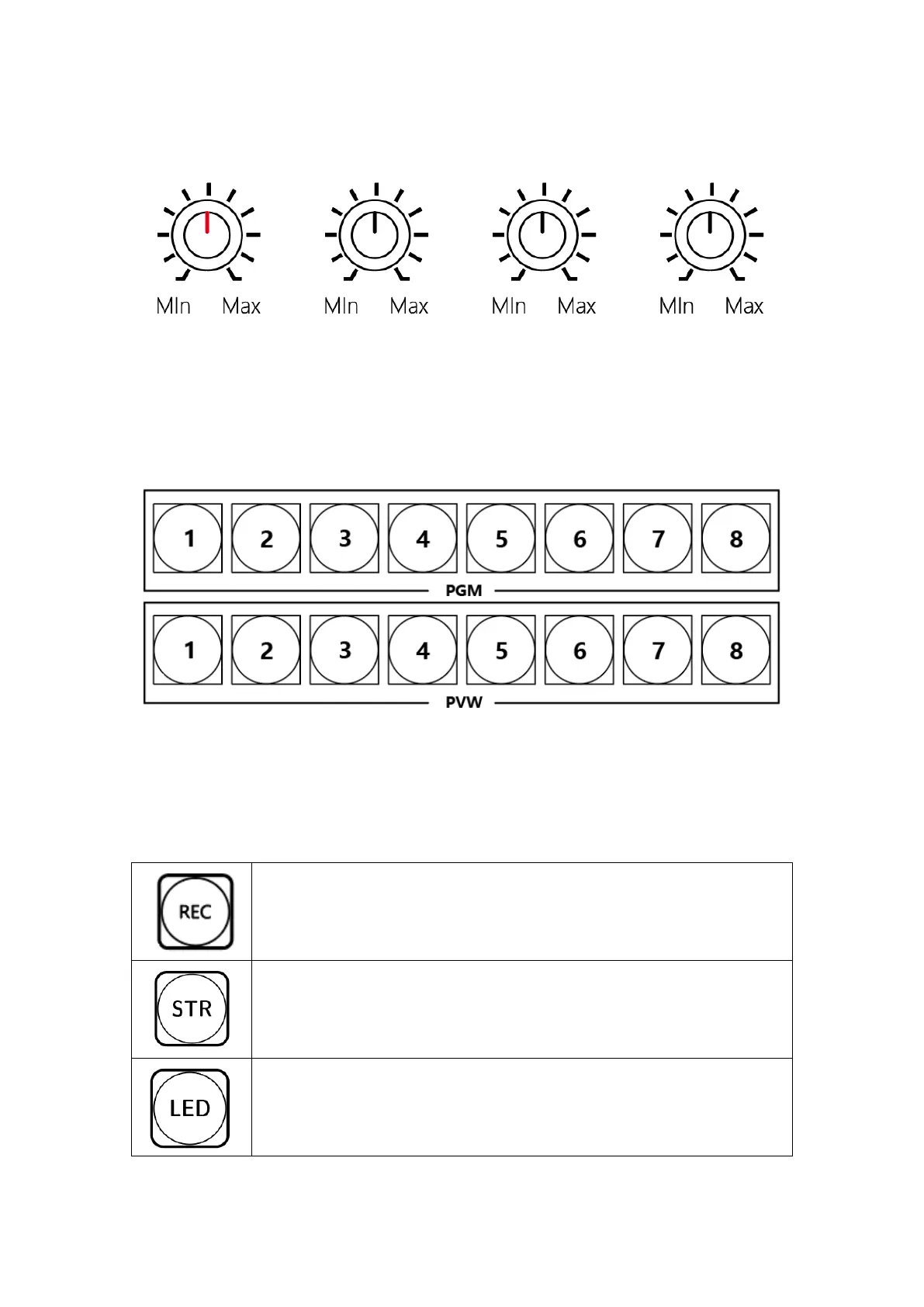 PGM/PVW main cut output and preview monitoring buttons, providing 1-8