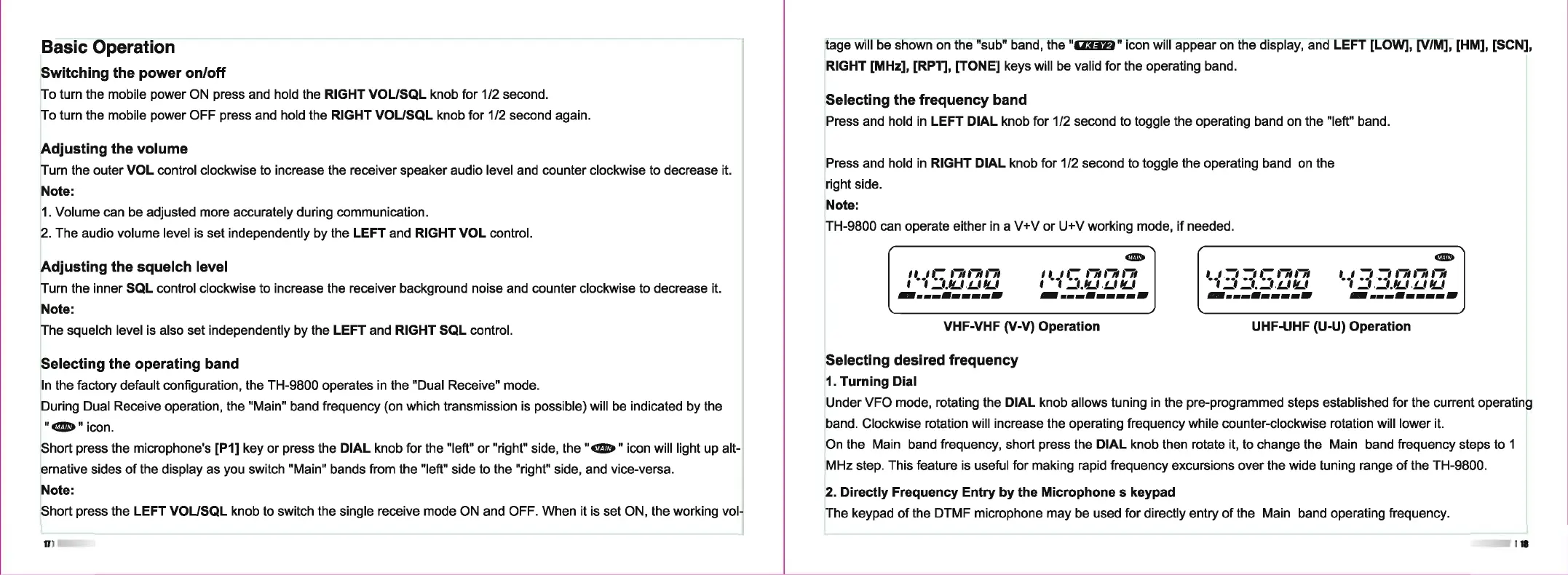 TYT TH-9800 - Basic Operation; Power, Volume, and Squelch Adjustments; Band and Frequency Selection