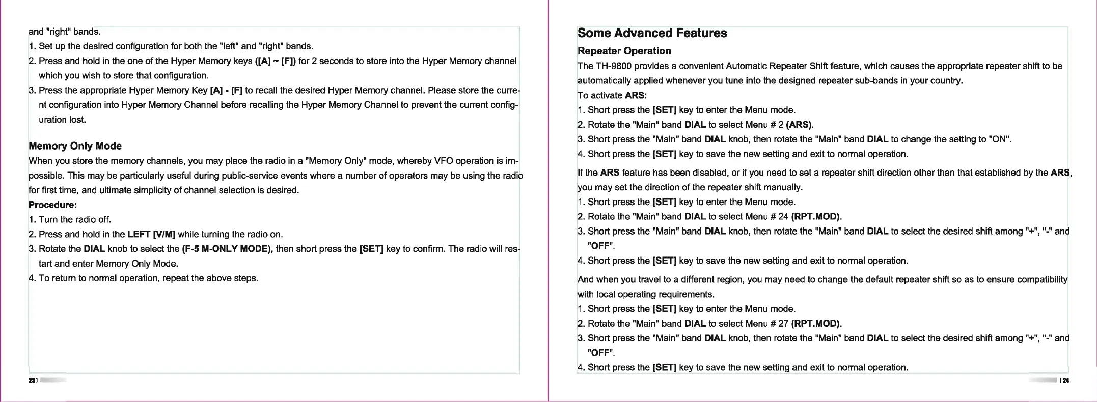 TYT TH-9800 - Advanced Operation Features; Memory Only Mode; Repeater Operation Setup