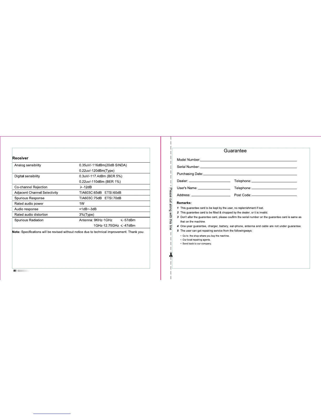 Tytera MD-380 - Receiver Specifications; Product Guarantee Information