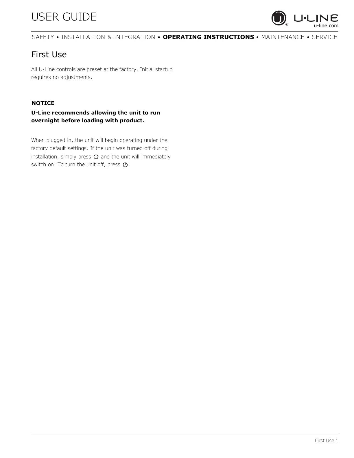 All U-Line controls are preset at the factory. Initial startup