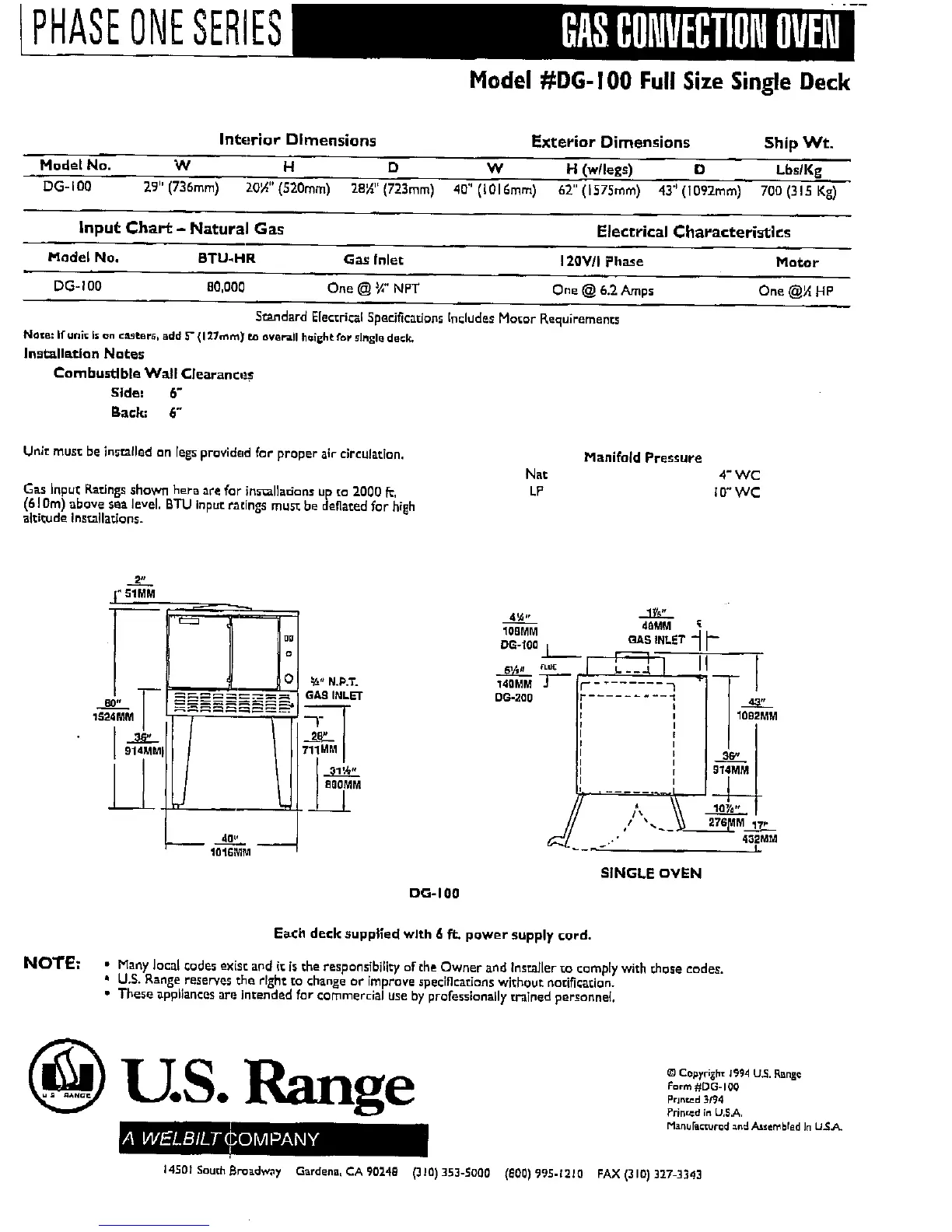 U.S. Range DG-100 - Installation Notes and Clearances; Combustible Wall Clearances