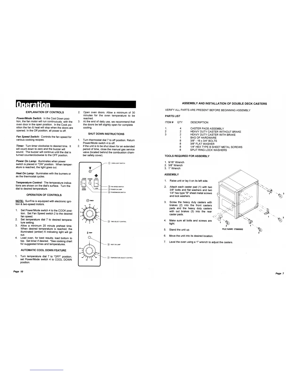 U.S. Range SunFire SDG-1 - Assembly & Installation of Double Deck Casters; Operation; Explanation of Controls; Operation of Controls