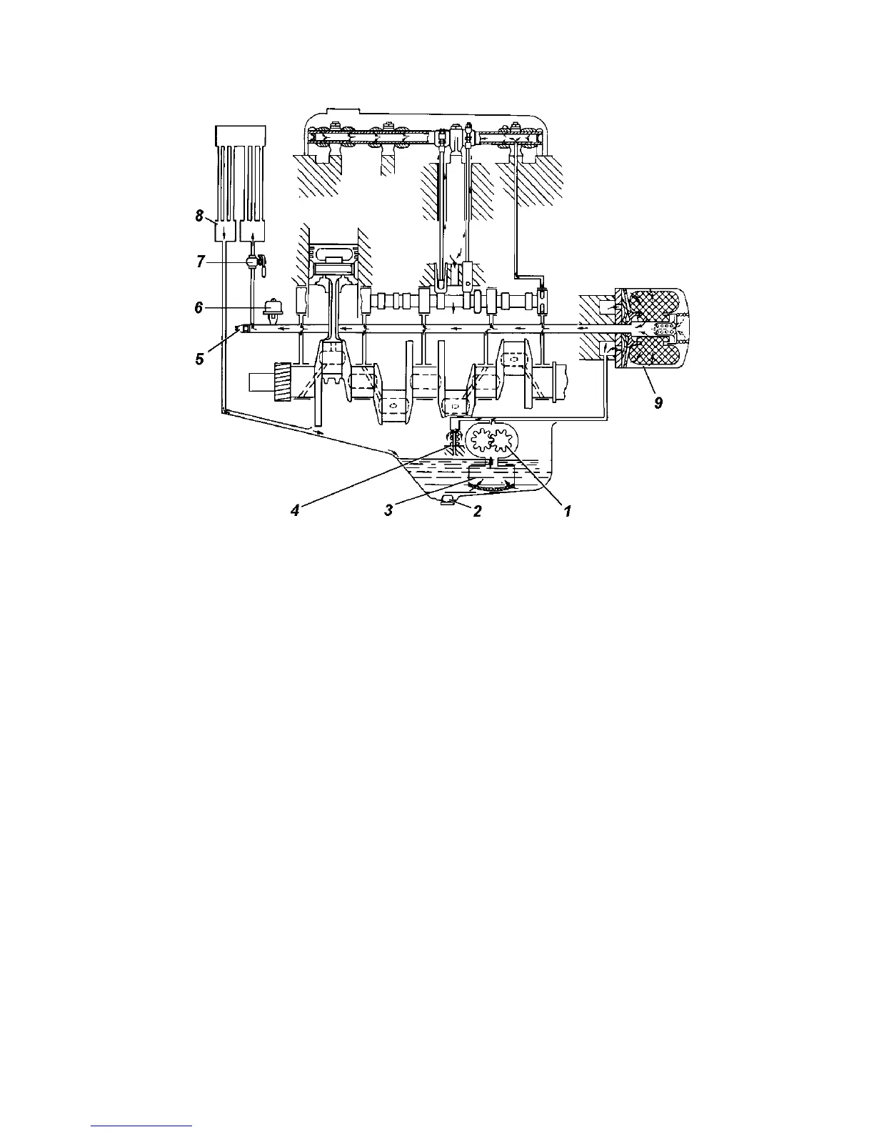 1-oil pump; 2 -oil sump drain plug; 3 -oil intake strainer; 4-pressure relief valve;