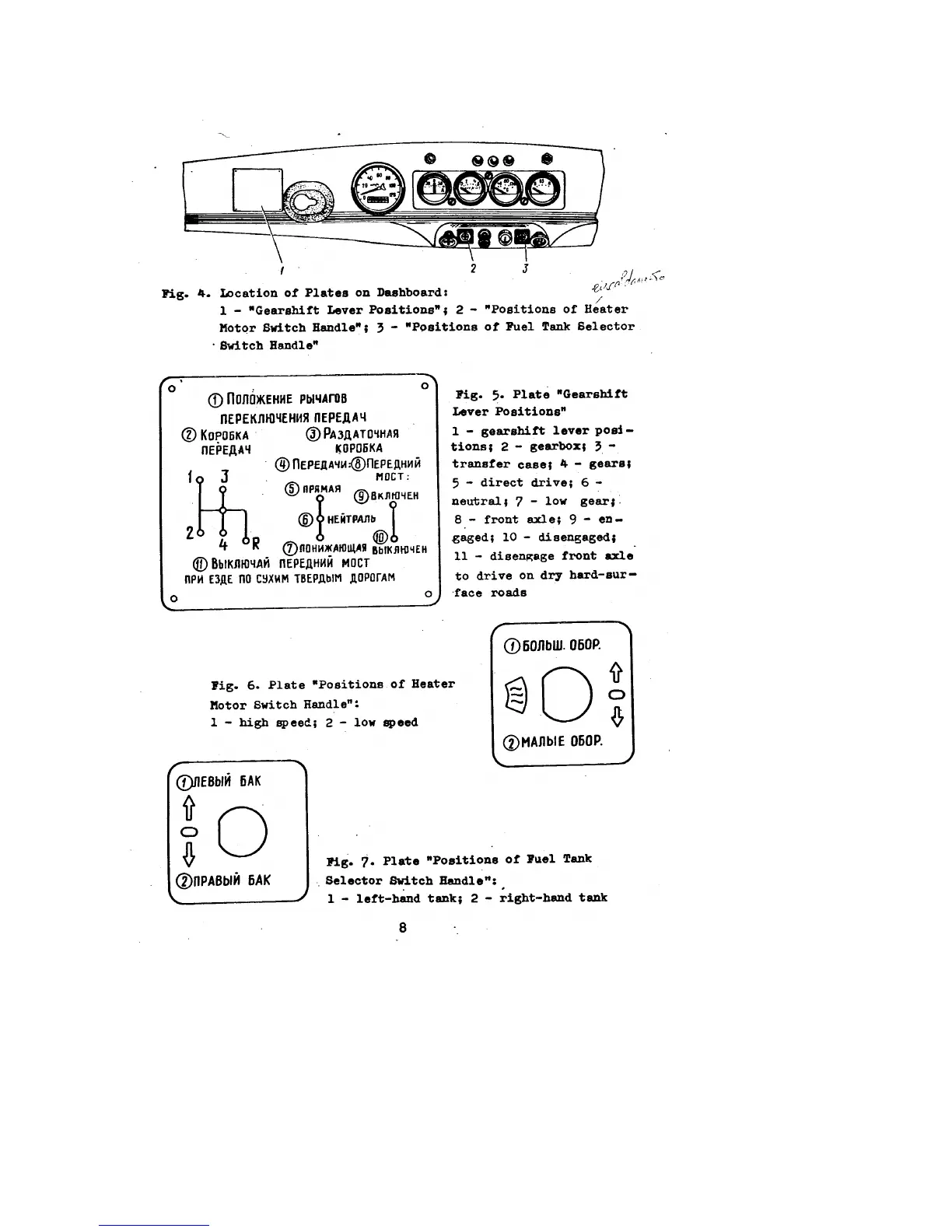 UAZ 469B - Location of Plates on Dashboard; Plate Gearshift Lever Position; Plate Positions of Heater Motor Switch Handle; Plate Positions of Fuel Tank Selector Switch Handle