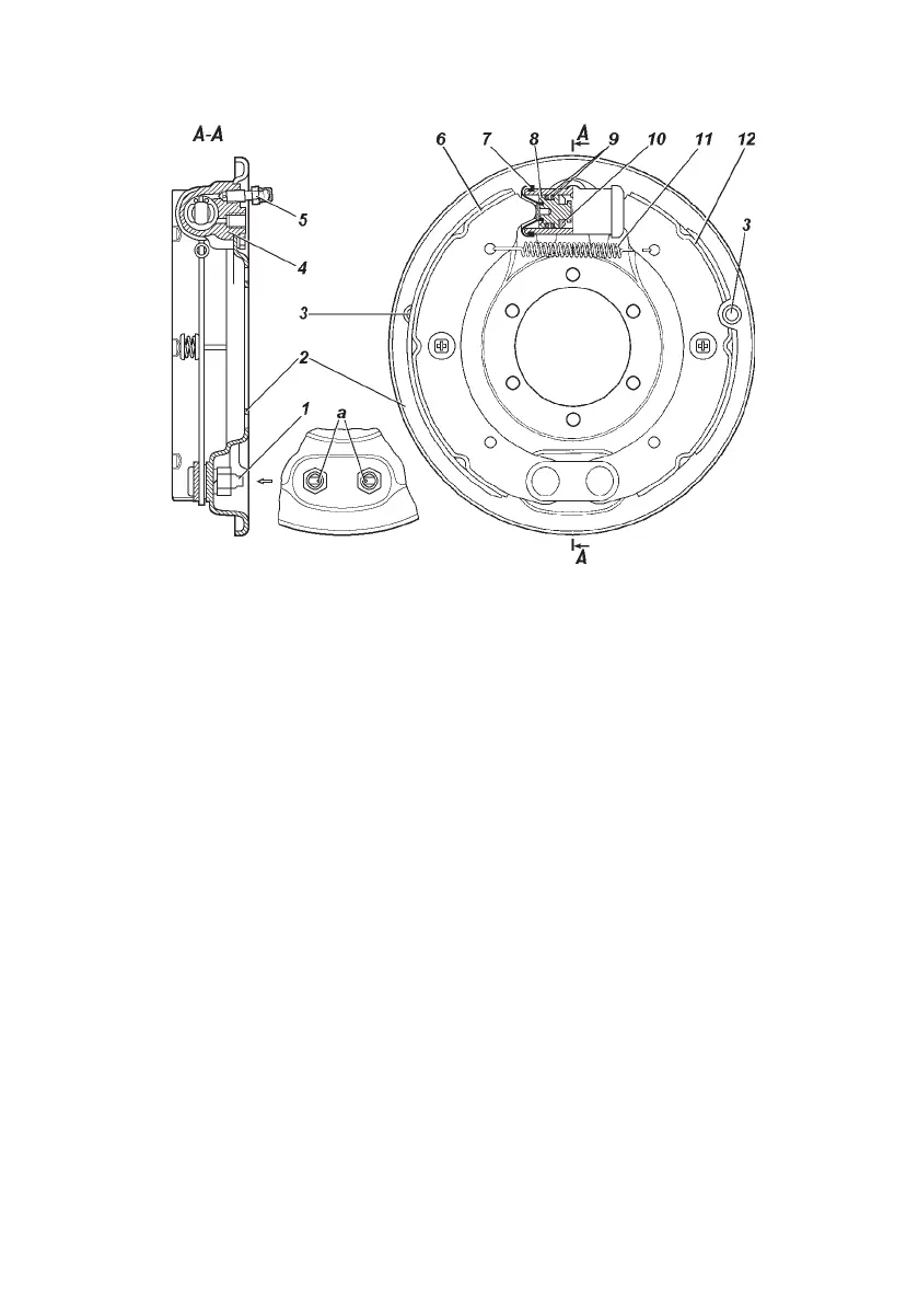 of brake linings; 4 — wheel brake cylinder; 5 — bypass valve; 6,12 — brake shoes;