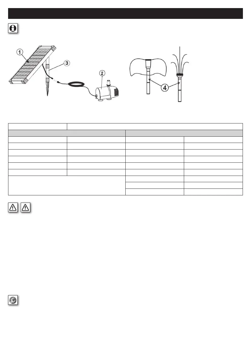 Dit product is uitsluitend bedoeld voor privégebruik in kleine tuinvijvers. Om de pomp te kunnen laten werken is er direct zonlicht nodig. Zodra de pomp en het zonnepaneel met