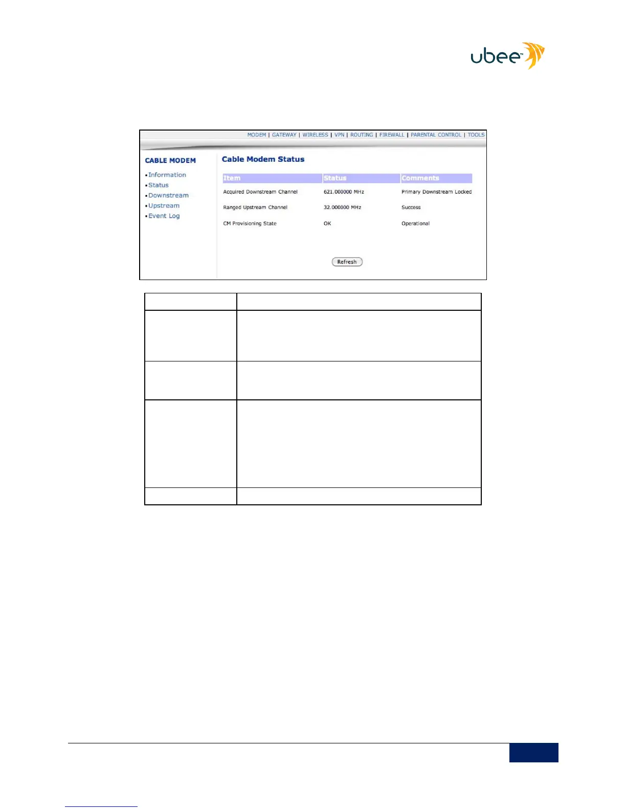 modem is online. The Status column shows the