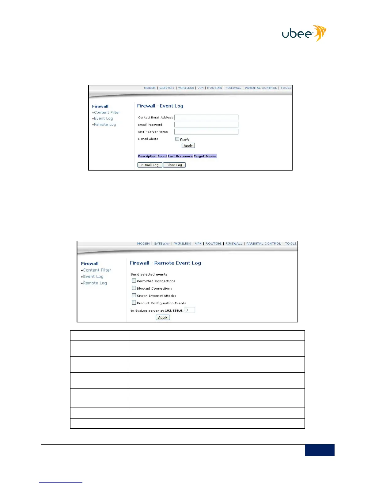 The Remote Log option allows you to configure firewall remote logging of specific events as traffic is passed and/or