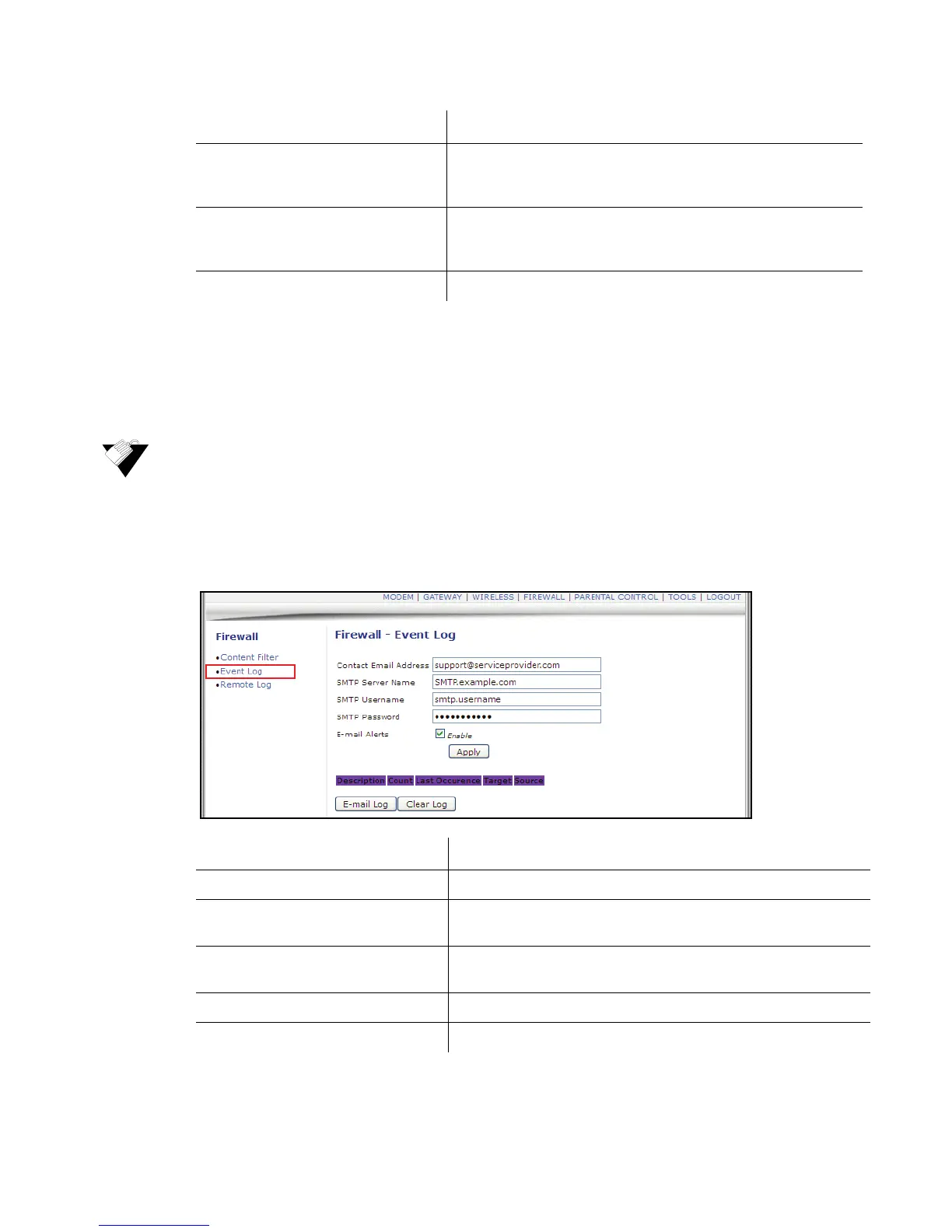 The Event Log option allows you to configure firewall event log reporting via email alerts