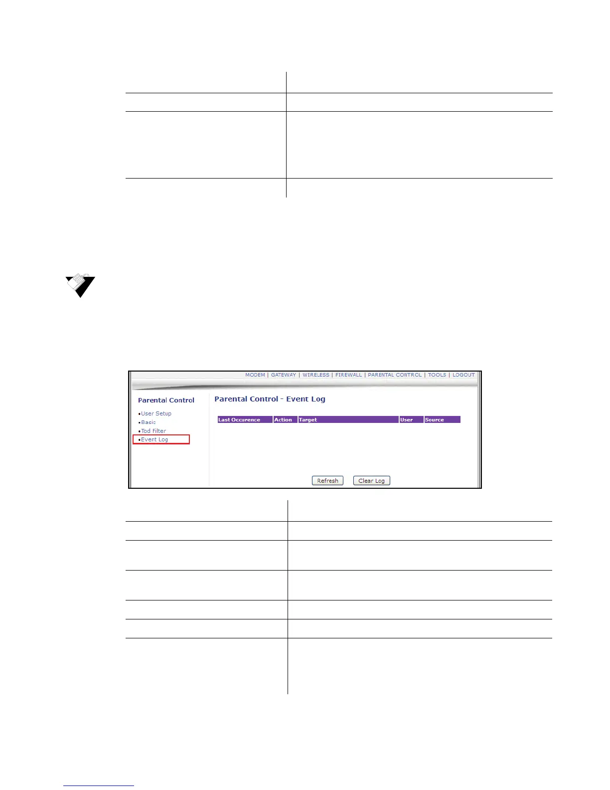 The Event Log option displays Parental Control event log reporting.