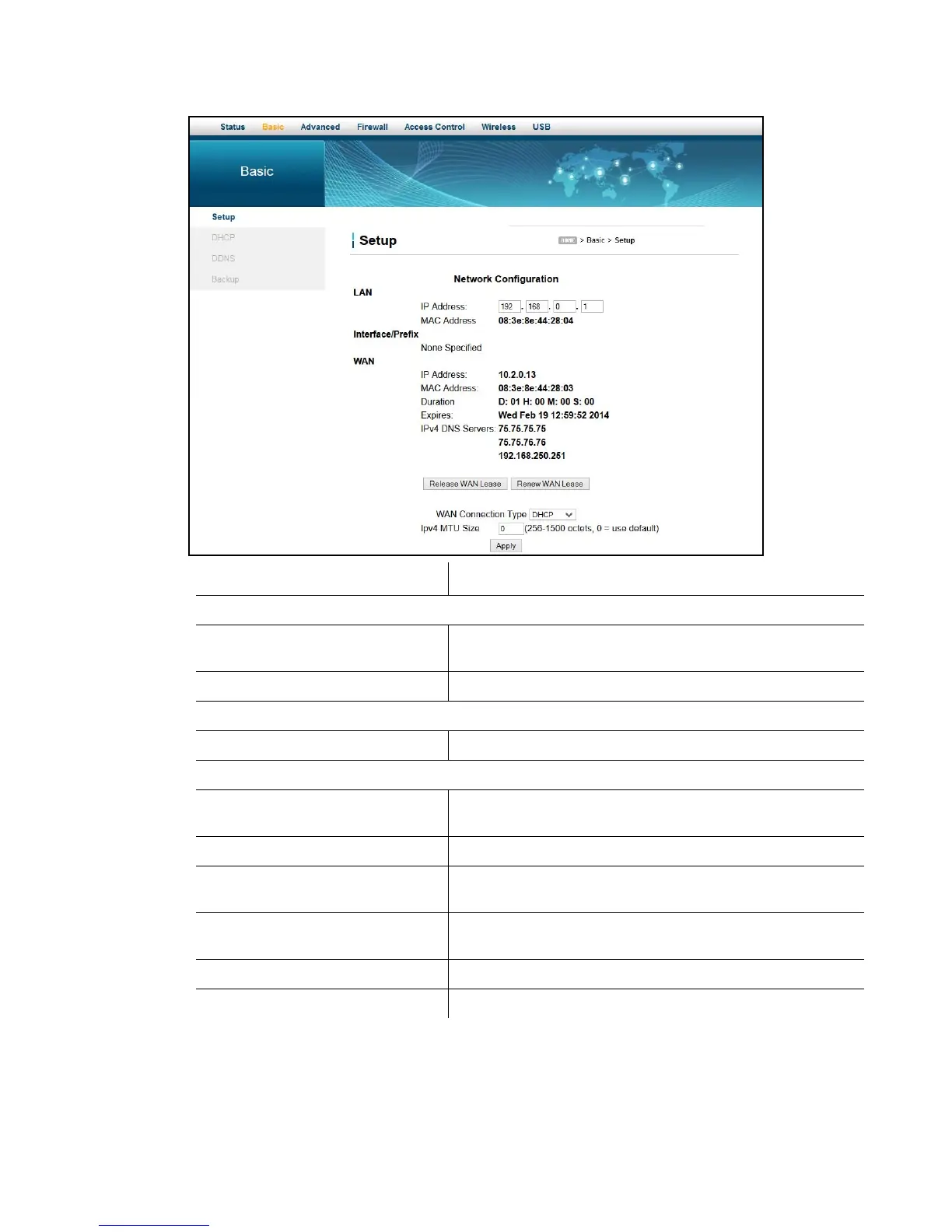 Renew WAN Lease Renews the WAN IP address when clicked.