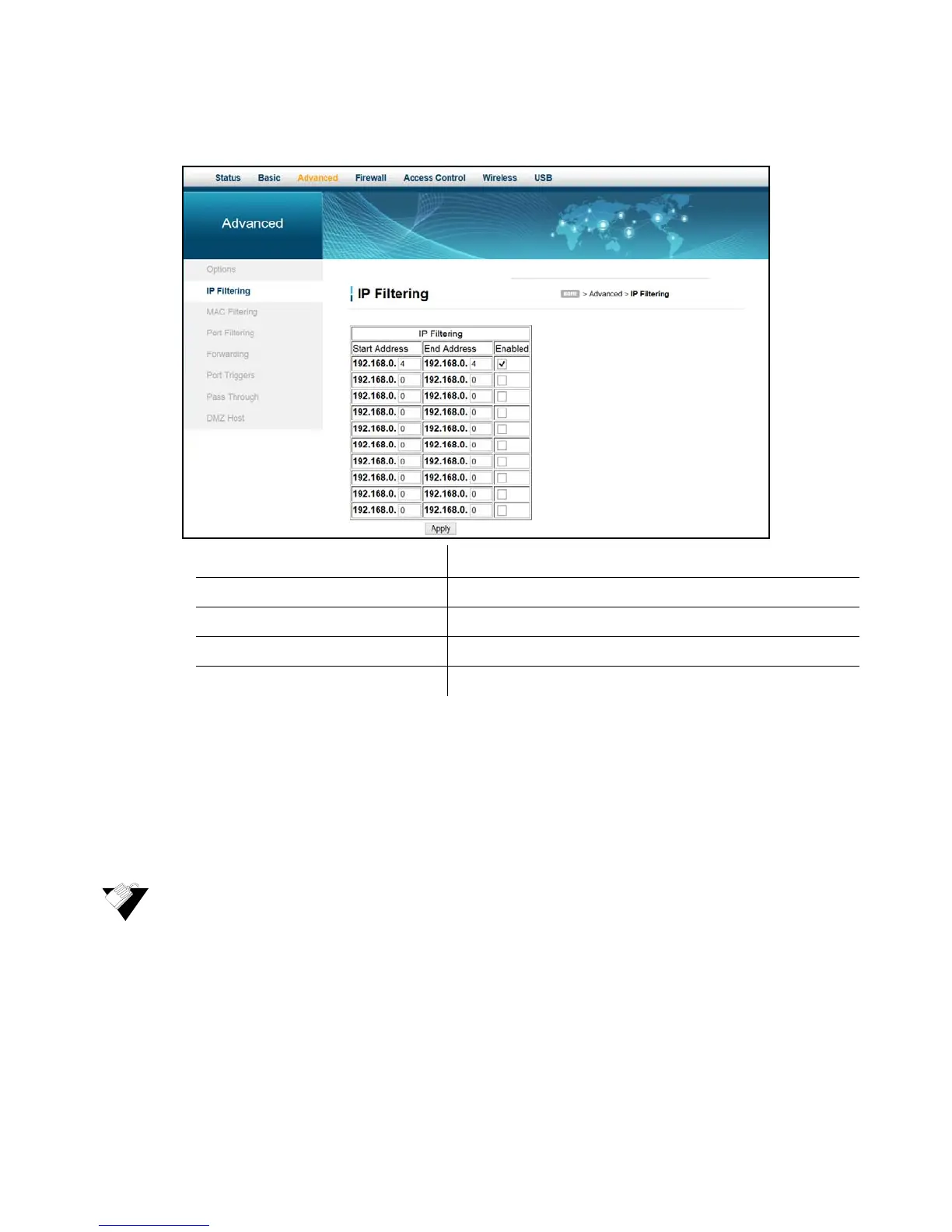 4. Click IP Filtering from the left side menu. Field descriptions are listed below the