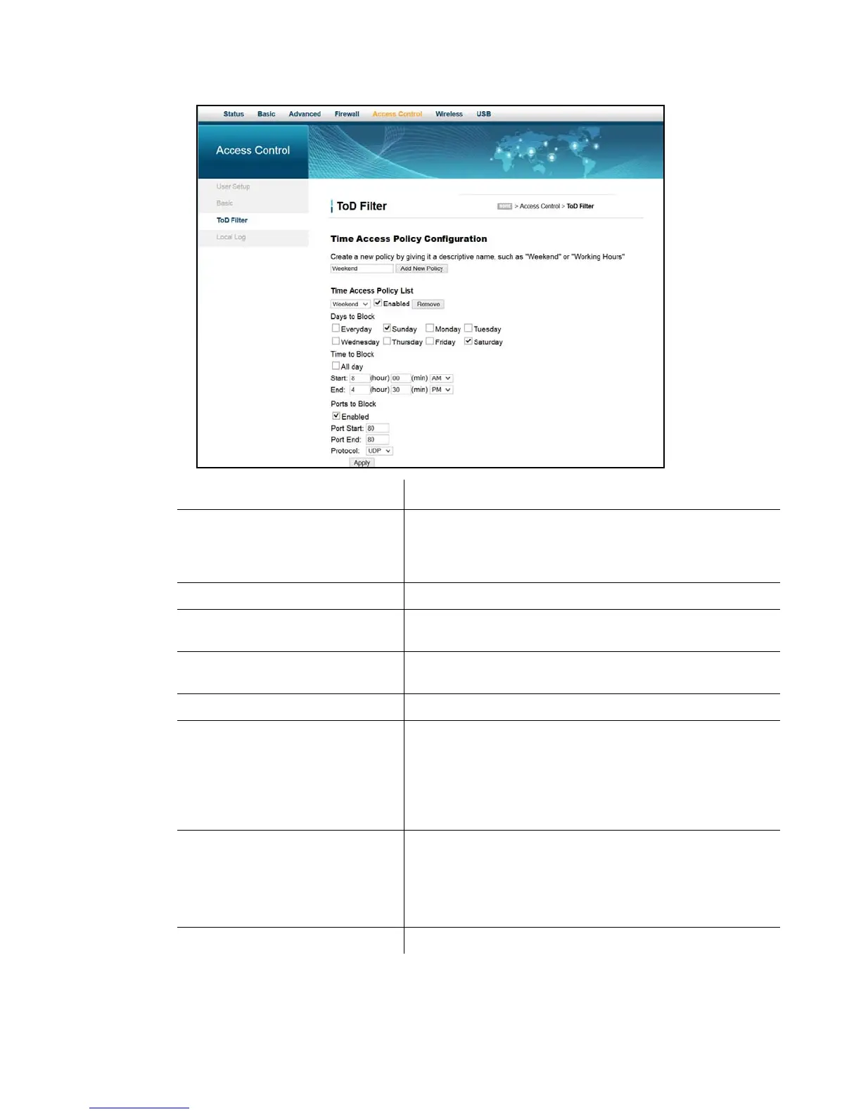Time Access Policy List Lists the existing policies in a drop-down menu.