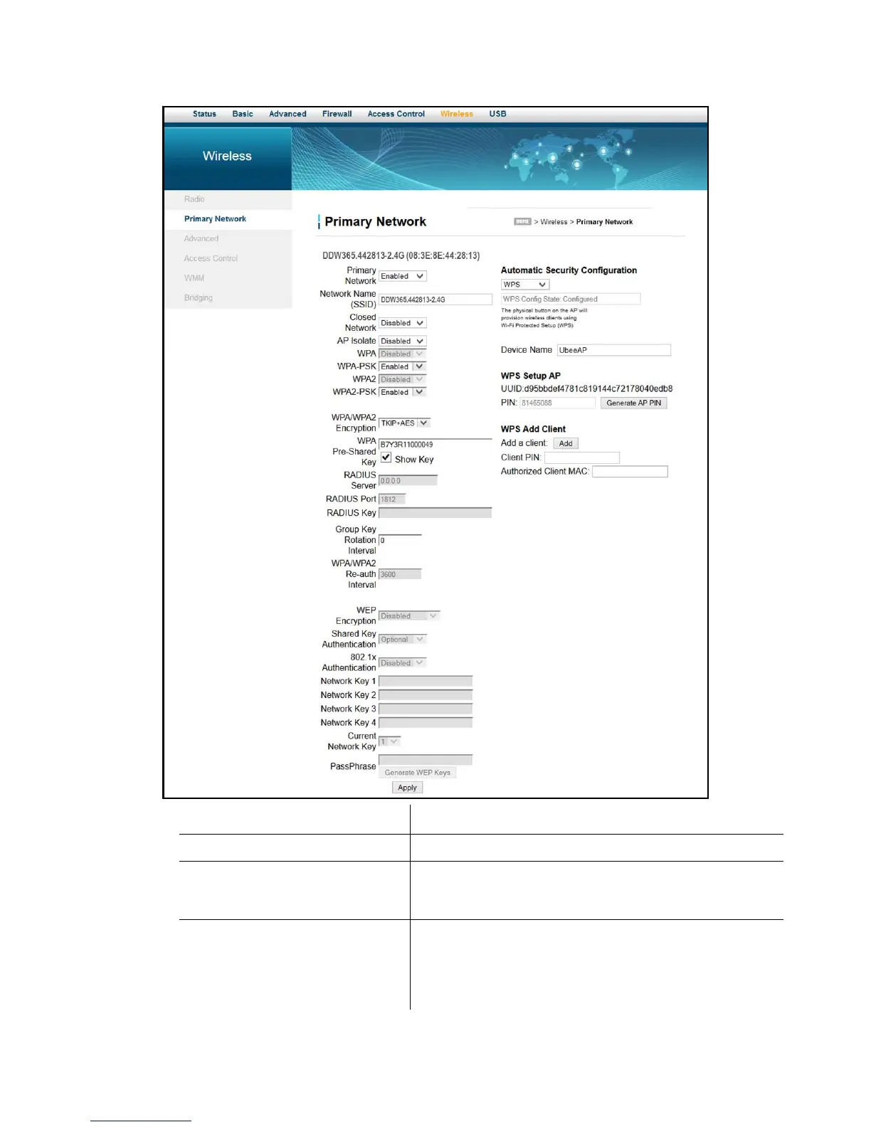 Network Name (SSID) Defines a unique SSID for the DDW365 or uses the default.